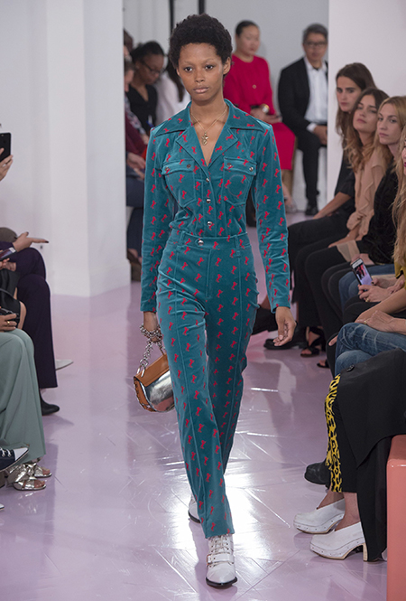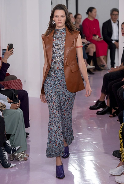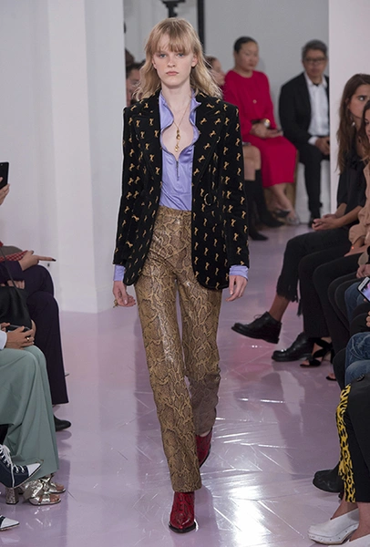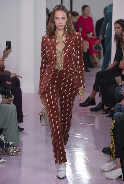 Главным референсом коллекции Рамсей-Леви сделала тему Дикого Запада. Отсюда – принт в виде крошечных лошадей, которым усыпаны ярко-голубой комбинезон, черный жакет и брючный костюм цвета охры. В тоже время этот узор снова отсылает к истории модного дома, - лошадей обожали Стелла Маккартни и Фиби Файло.