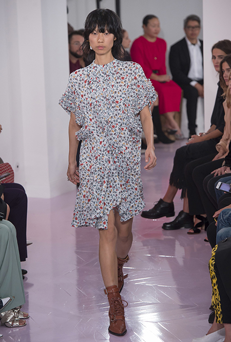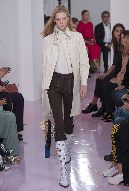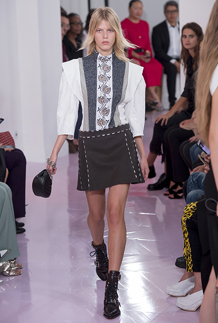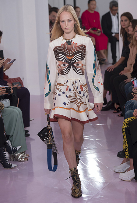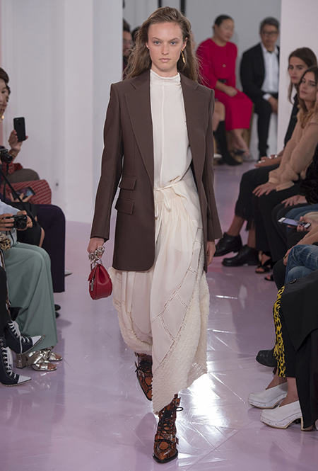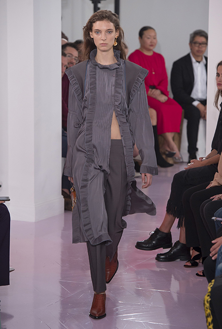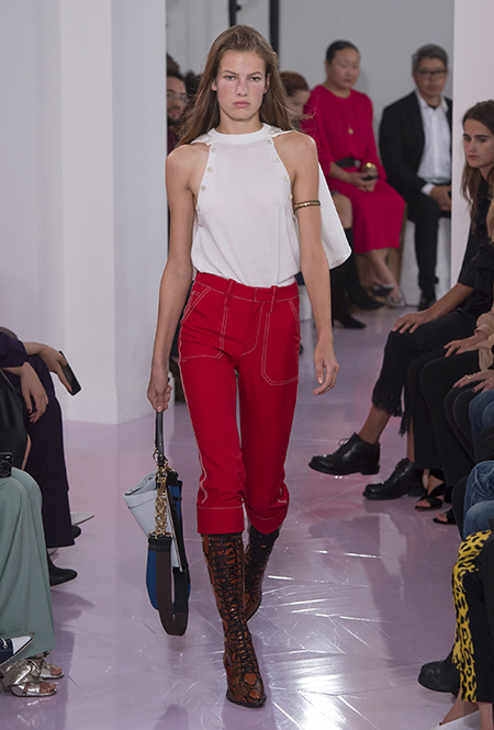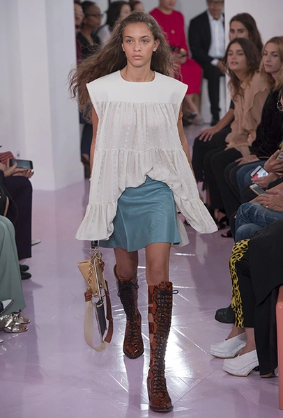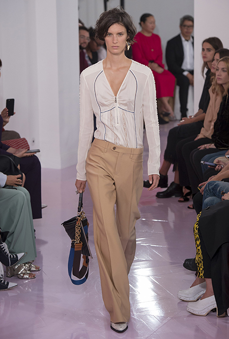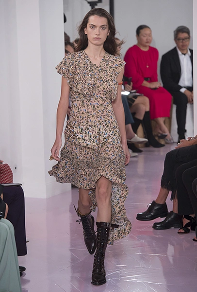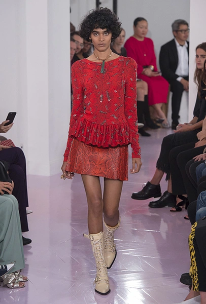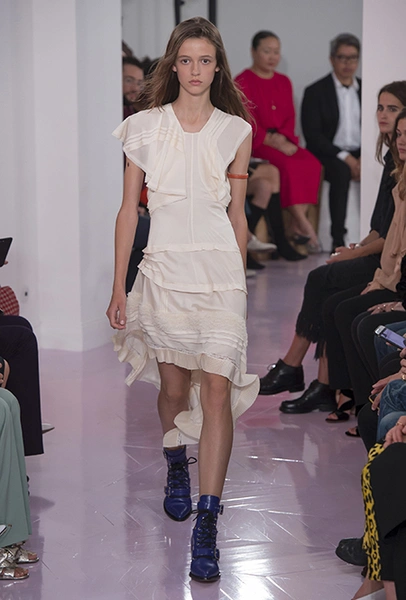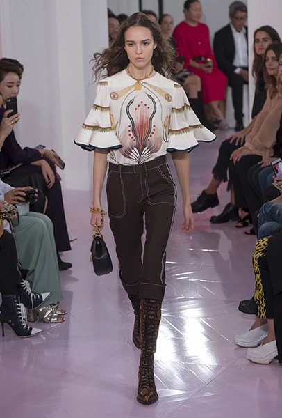 Как и в прошлом сезоне, когда у руля еще была перешедшая затем в Givenchy Клэр Уэйт Келлер, здесь много крупных оборок. Похожие на крылья объемные оборчатые рукава вообще могут с этого сезона стать визитной карточкой марки. Они есть на блузах и коротких, длиной до середины бедра, платьях. На некоторых вещах встречается их урезанный вариант – когда рукава не такие длинные, но все равно пышные.