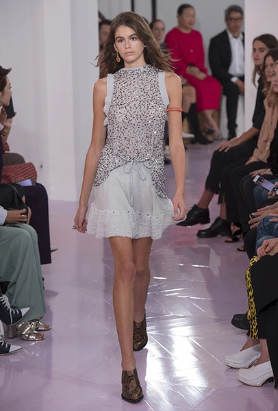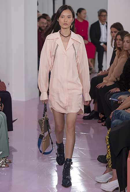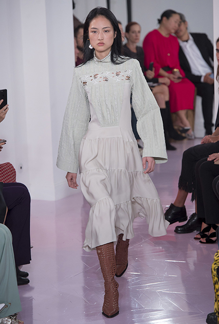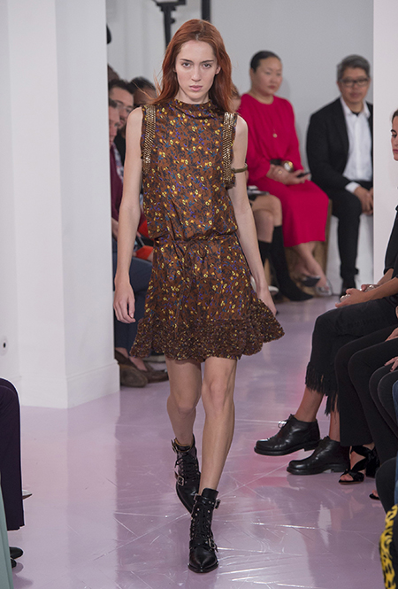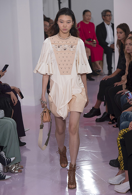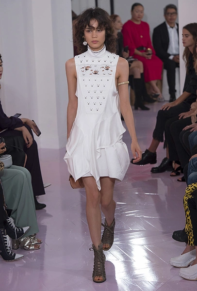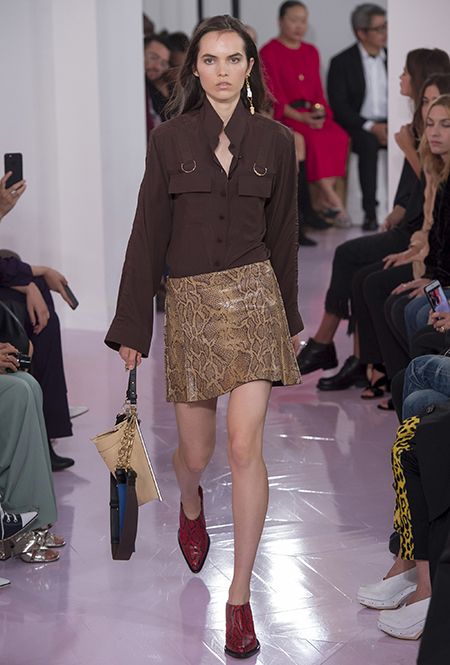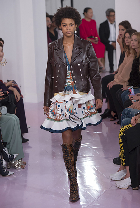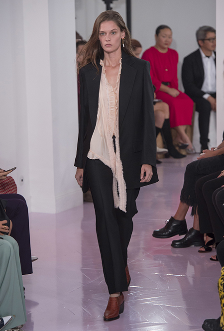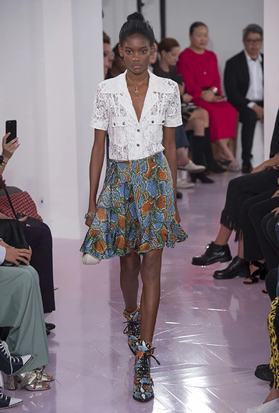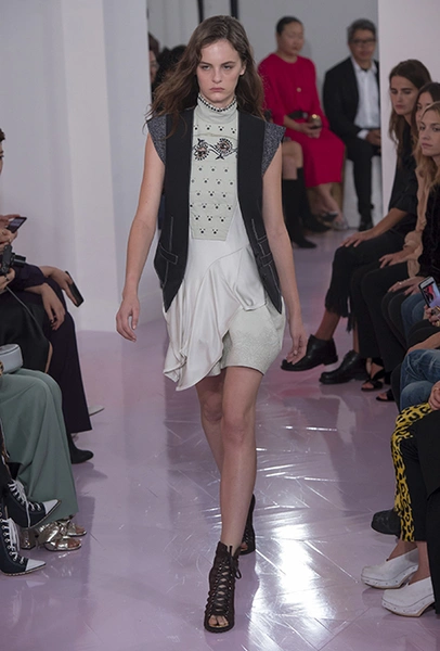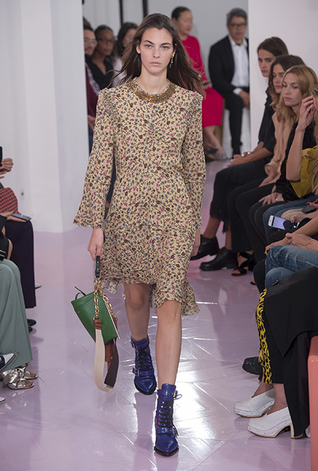 Как и в прошлом сезоне, когда у руля еще была перешедшая затем в Givenchy Клэр Уэйт Келлер, здесь много крупных оборок. Похожие на крылья объемные оборчатые рукава вообще могут с этого сезона стать визитной карточкой марки. Они есть на блузах и коротких, длиной до середины бедра, платьях. На некоторых вещах встречается их урезанный вариант – когда рукава не такие длинные, но все равно пышные.