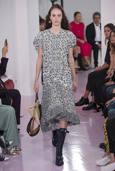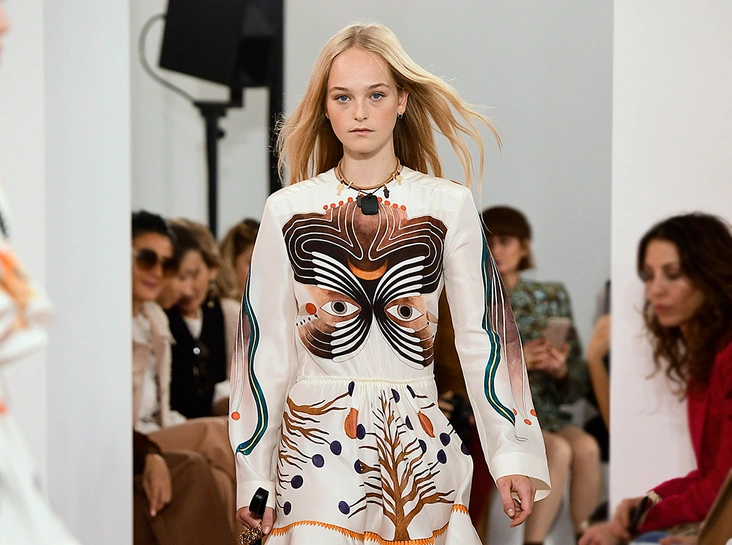 Один из основных принтов коллекции – мелкий цветочный рисунок, и это тоже реверанс Рамсей-Леви в сторону предшественницы. Кроме цветов, здесь есть яркие, словно от руки сделанные рисунки – огромные глаза, листья, ветви деревьев. Похожие принты любил Карл Лагерфельд, который тоже когда-то был креативным директором Chloe.