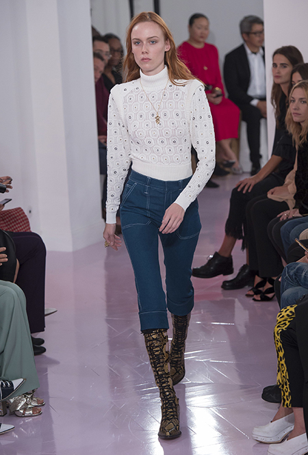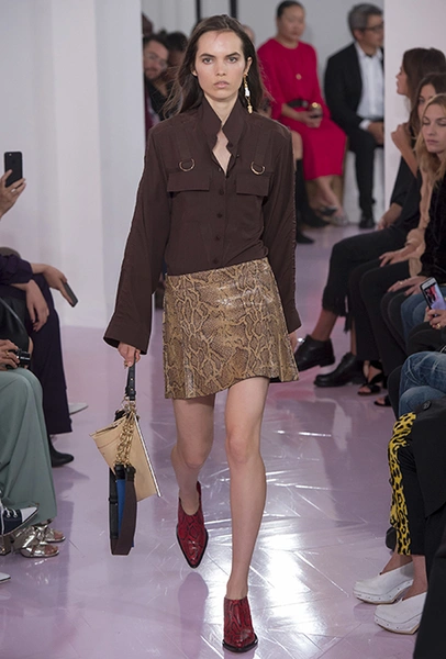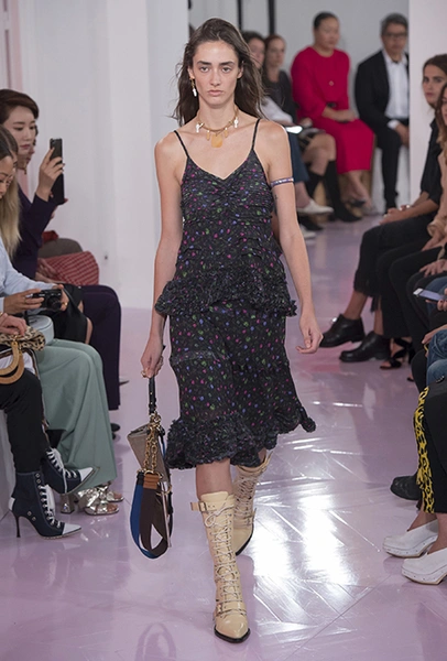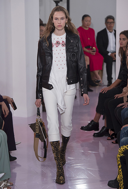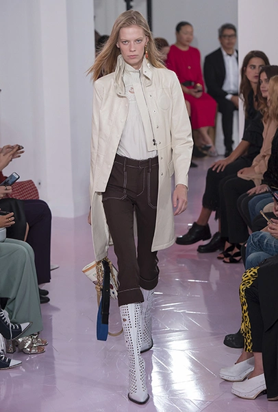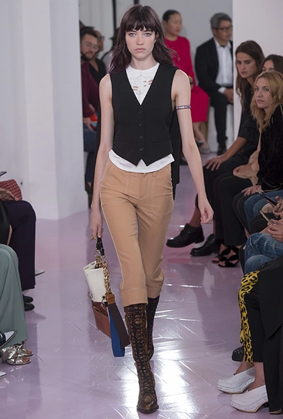 Об американских прериях напоминают вещи из кожи питона – мини-юбка и длинные прямые брюки – обилие металлических колец и кожаных пайеток в отделке, а также главный аксессуар – грубые ковбойские сапоги, которые Рамсей-Леви сделала перфорированными. Еще несколько лет назад похожие модели с перфорацией наводнили улицы всех крупных городов. Готовимся: они вот-вот вернутся. Кроме них, продажи бренду наверняка «сделают» сапоги и туфли на длинной шнуровке (привет, наездники!) и сумки – здесь они как крупные прямоугольные из плотной ткани, так и миниатюрные кожаные – некоторые снова с «наивными» рисунками на них.