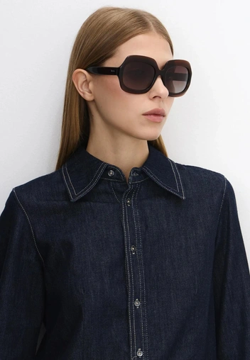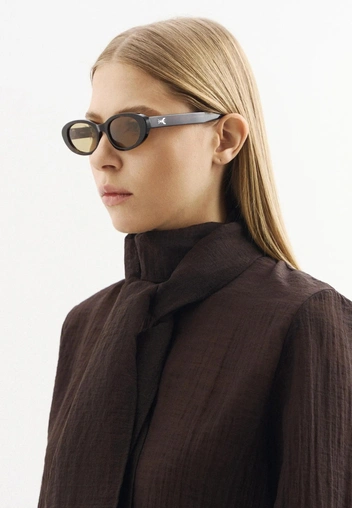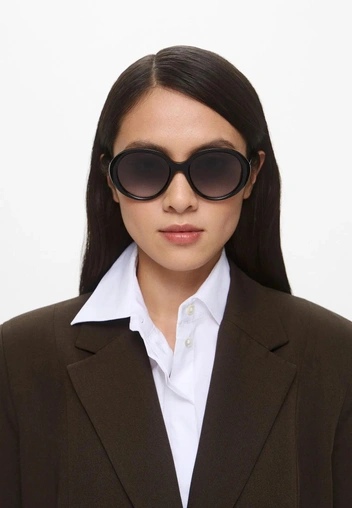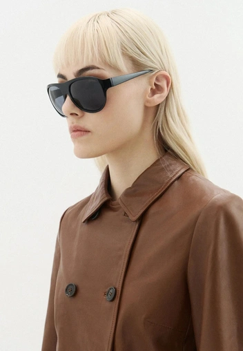 Самый легкий способ — не пытаться сразу повторить подиумные аутфиты Balenciaga, а начать с максимально лаконичной крупной оправы: акцентный черный баг-ай, мягкий овальный силуэт, минимум фурнитуры. Такие очки легко стилизуются и с пальто-халатом, и с белой футболкой, и с летним платьем в цветочек — они не спорят с одеждой, а просто добавляют образам нужный уровень драматургии.