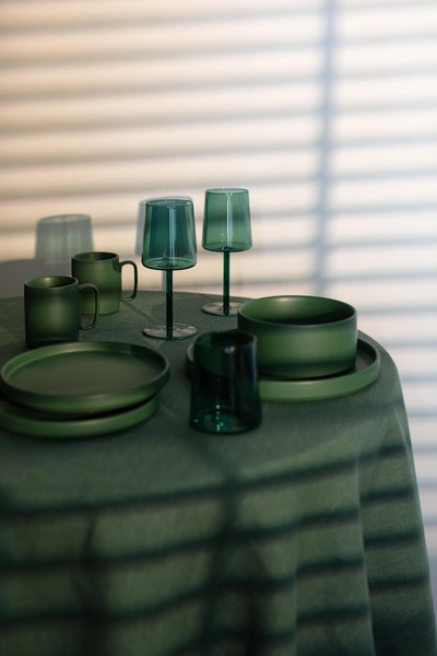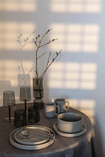 В ассортименте — столовая посуда из керамики в еловом, молочно-бежевом, терракотовом и сером цветах. Также в коллекции представлена посуда из стекла и вазы-подсвечники в васильково-синем, графитовом, бирюзово-изумрудном и янтарном оттенках, кроме этого, можно найти и прозрачные изделия.