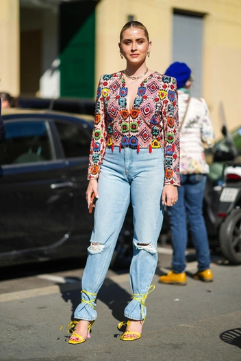 Еще один модный способ носить босоножки на завязках — это подвязать ими нижнюю часть джинсов. Для этой цели не подойдут скинни или прямые модели, необходимо подобрать широкие фасоны, например, бэгги или клеш, которые в 2023 году есть в гардеробе практически у каждой из нас (читайте также: Ниже и шире: 5 моделей летней обуви, которые беспощадно укорачивают рост (и чем их заменить)).