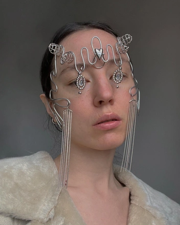 Украшения Pilepchuk выглядят как AR-маски — но нет, все существует в физическом пространстве. За брендом стоит художница Настя Пилепчук. Она родилась в Якутии, а затем почти все детство провела в Бурятии, где развит культ шаманизма и где верят в существование особых духовных миров. Во время местных ритуалов маски помогают перевоплощаться в животных и других существ — как раз эту идею Настя держит в уме, когда придумывает свои безумные face pieces. Все маски сделаны художницей вручную в единичном экземпляре.