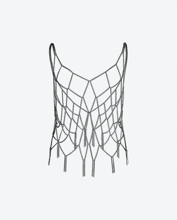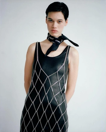Специалитет ярославского бренда — вещи из цепочек, кольчуги двадцать первого века. Не то одежда, не то украшение, не то и вовсе арт-объект. Из тонких цепочек у Omut сделаны топы, платья-сетки, фартуки и портупеи. Конструкции удобные, кольчуги тянутся и удачно садятся на любую фигуру. Подразумевается, что носят их верхним слоем с облегающими вещами: топами, легинсами, платьями или поверх приталенных жакетов.