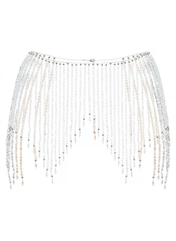 Было неожиданно встретить у бельевой марки Petra целую линию украшений для тела: бюстгальтеры и трусики из жемчужин, бисерные пояса и подвязки из стеклянных бусин. Все это, конечно, очень интимное и показывается за закрытыми дверями. Но кое-что из ассортимента можем представить и на публике: в поясе из стеклянных бусин, надетом поверх платья или легинсов, мы бы отправились на концерт Бейонсе предстоящего тура Renaissance.