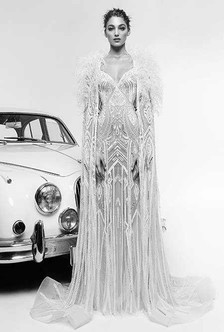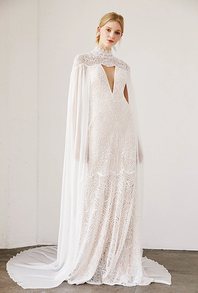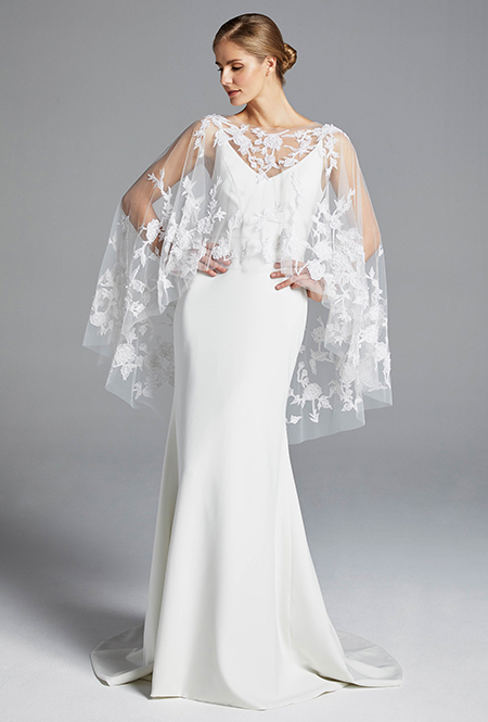 Кейп или накидка – это элемент, которым некоторые современные свадебные дизайнеры предлагают заменить фату. Наброшенный на плечи, кейп придает наряду торжественности и делает его похожим на средневековое одеяние. У Zuhair Murad кейп украшен перьями, а у Tadashi Shodji – вшит в лиф, так что составляет с платьем единую «конструкцию».