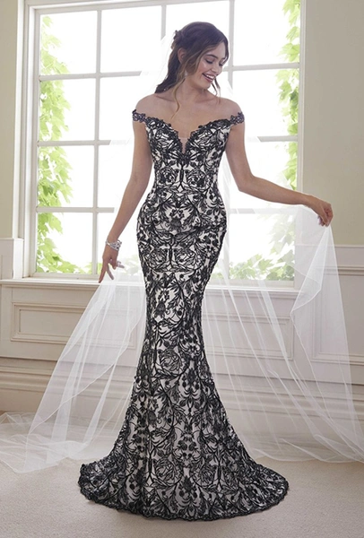 Вроде бы и декольте, а вроде бы и не совсем. Платья с опущенной линией плеч выглядят сексуальными, но не призывными. У Carolina Herrera такое платье минималистично и элегантно, а у Tadashi Shoji кружевные рукава ниспадают так красиво, что на наряд хочется любоваться как на уникальное произведение искусства.