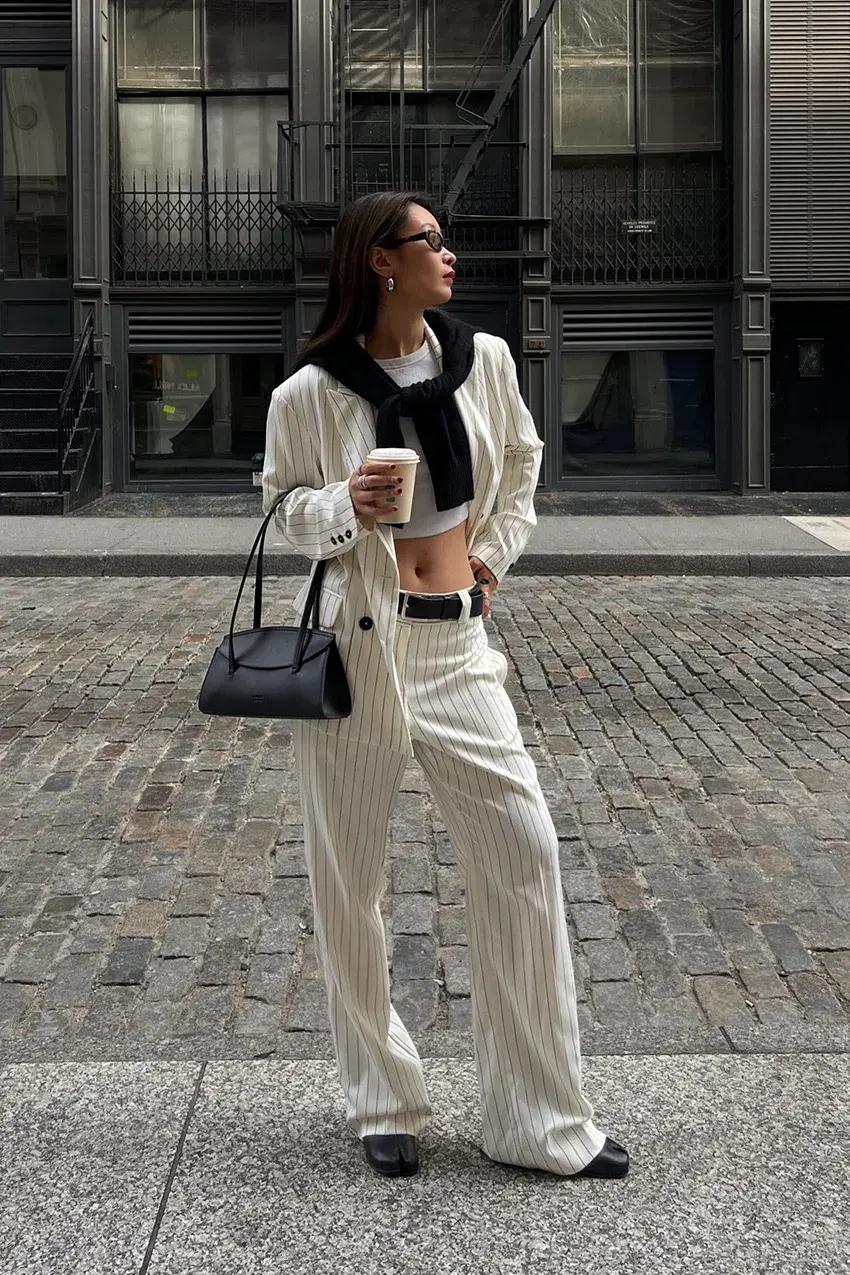 4. Повседневный шик — расслабленный стиль. Если хотите сделать образ более расслабленным, наденьте под костюм футболку или легкий свитер и «упростите» обувь до стильных лоферов или белых кед. Такой образ легко впишется в ваш повседневный гардероб.