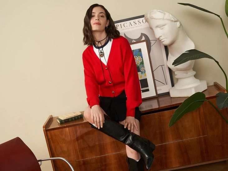 Весна — это история о моде, о тебе. Разрешите себе быть разной и посмотрите на себя с новой стороны. Хочется добавить в гардероб более дерзких вещей? Действуйте, ведь современные бренды поддерживают наш внутренний голос и желания. Начать предлагаем с красного цвета, который стал самым модным в весенне-летнем сезоне 2024 года. Выберите, к примеру, укороченный алый кардиган с фигурными пуговицами в виде сердец и подберите к нему белый топ в духе нулевых и стильную . Эффектности образу придадут сапоги-трубы с широким голенищем и массивное колье.