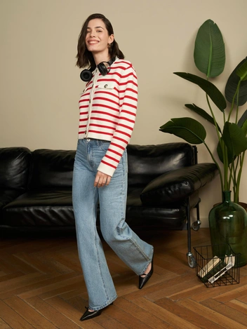Примерьте голубые или темно-синие расклешенные джинсы и дополните их расслабленным с акцентными красными полосками и деревянными пуговицами или более нарядным укороченным жакетом в духе «тихой роскоши». В обуви француженки отдают предпочтение удобству и красоте, поэтому подберите к выходу балетки с острым или квадратным мысом или туфли: например, слингбэки или мюли на невысоком каблуке. Завершите образ кожаной сумкой и минималистичными украшениями, чтобы не перегружать его и соблюсти баланс.