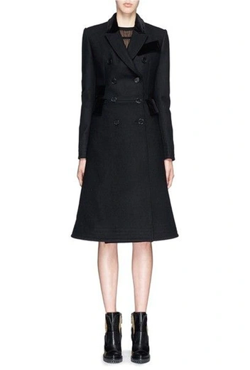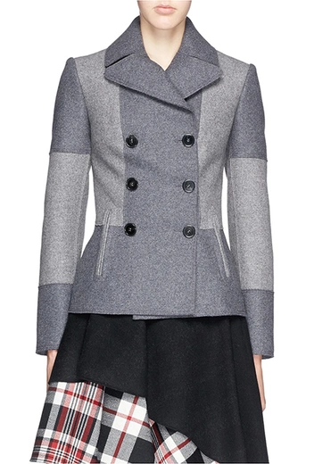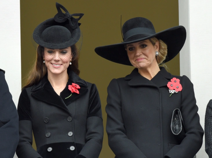 Бывает, что стилистам герцогини может приглянуться сразу несколько фасонов из коллекции, которые дизайнер соединяет воедино — к этому приему модное королевское окружение обращается довольно часто. Такая участь постигла классический двубортный жакет и черное приталенное пальто из коллекции Alexander McQueen — гибридную вещь, черный жакет в технике пэчворк, герцогиня надела в 2015 году на церемонию в память о погибших в мировых войнах.