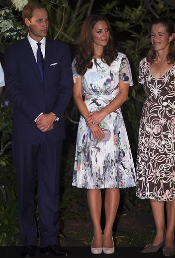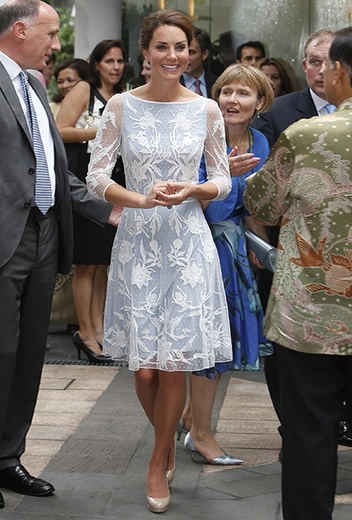 Британский бренд Temperley London также доказал, что готов сотрудничать с высшими и требовательными особами и видоизменять в своих образах все, что герцогиню не устраивает. В модифицированном наряде Кейт появилась на чаепитии в Куала-Лумпуре. Цвет платья меняется с драматического черного на небесно-голубой, а рукава укорачиваются до длины ¾ — казалось бы, коррективы совершенно незначительны, однако впечатление от наряда меняется кардинально.