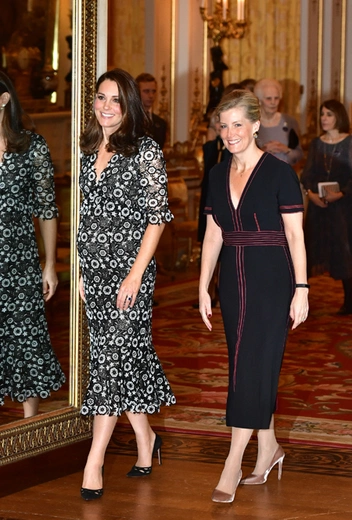А кружевное платье с V-образным вырезом из Pre-Spring коллекции 2017 года превратилось из мини в миди — его герцогиня надела на прием в Букингемском дворце в феврале 2018 года.