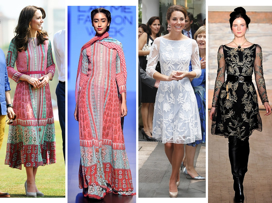 Чаще всего дизайнеры меняют цвет, материал или убирают лишние детали. Однако случается и так, что к образу, наоборот, добавляется новый декор, который делает наряд еще ярче и заметнее. Например, платью бренда Matthew Williamson из коллекции Pre-fall 2012 только деталей в виде камней на рукавах оказалось недостаточно, и такой же декор специально для Миддлтон добавили на воротник. Образ герцогиня, как это часто случается, носила два раза: в 2012-м и в 2015-м.