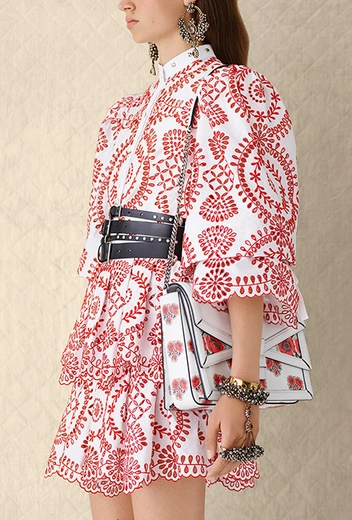 Например, незначительным изменениям подвергся образ из коллекции Resort 2017 года. Белое каскадное платье с алыми узорами для герцогини удлинили, а рукава сделали более классическими. Вариант, предложенный стилистами Alexander McQueen в лукбуке — с рядом черных кожаных ремней — также не совсем отвечает стилю герцогини, поэтому от каких-либо дополнительных акцентов по линии талии было решено отказаться.