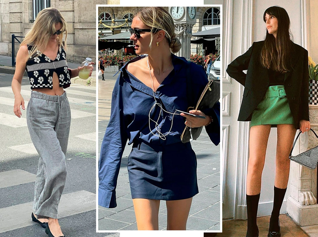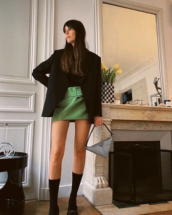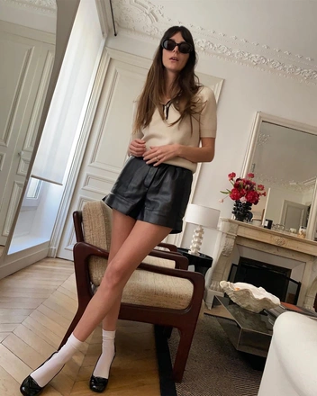 Шорты парижанки иногда меняют на короткие юбки. Француженки ценят комфорт, а потому длину мини стараются усмирить удобной обувью на плоском ходу и свободным верхом, вроде oversize-жакета, рубашки в мужском стиле или кардигана. По примеру it-girls добавляйте к такому луку высокие носки или гольфы, а также вместительную сумку, чтобы получить расслабленный и неформальный образ.