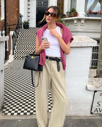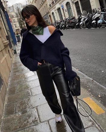 Осенний гардероб практически невозможно представить без кожи. Это один из самых популярных и востребованных материалов холодного сезона, который пользуется популярностью в том числе и среди жительниц Франции. Девушки выбирают модели классических цветов, черного, бежевого и винного, а также отдают предпочтение брюкам с высокой посадкой, прямыми штанинами или скинни. Брюки из кожи — универсальный предмет гардероба, который будет гармонично смотреться с любым верхом и обувью. По примеру французских it-girls сочетайте их с кардиганами, oversize-свитером или жакетом.