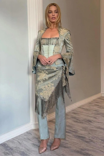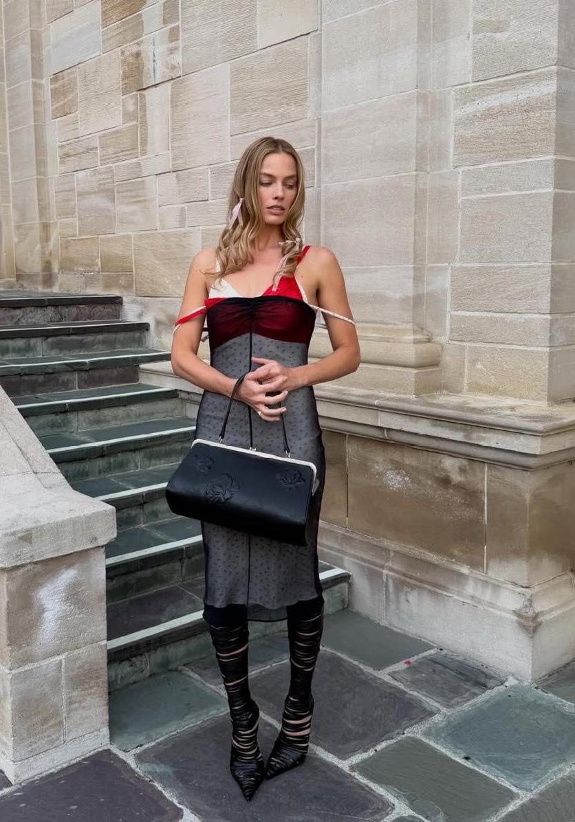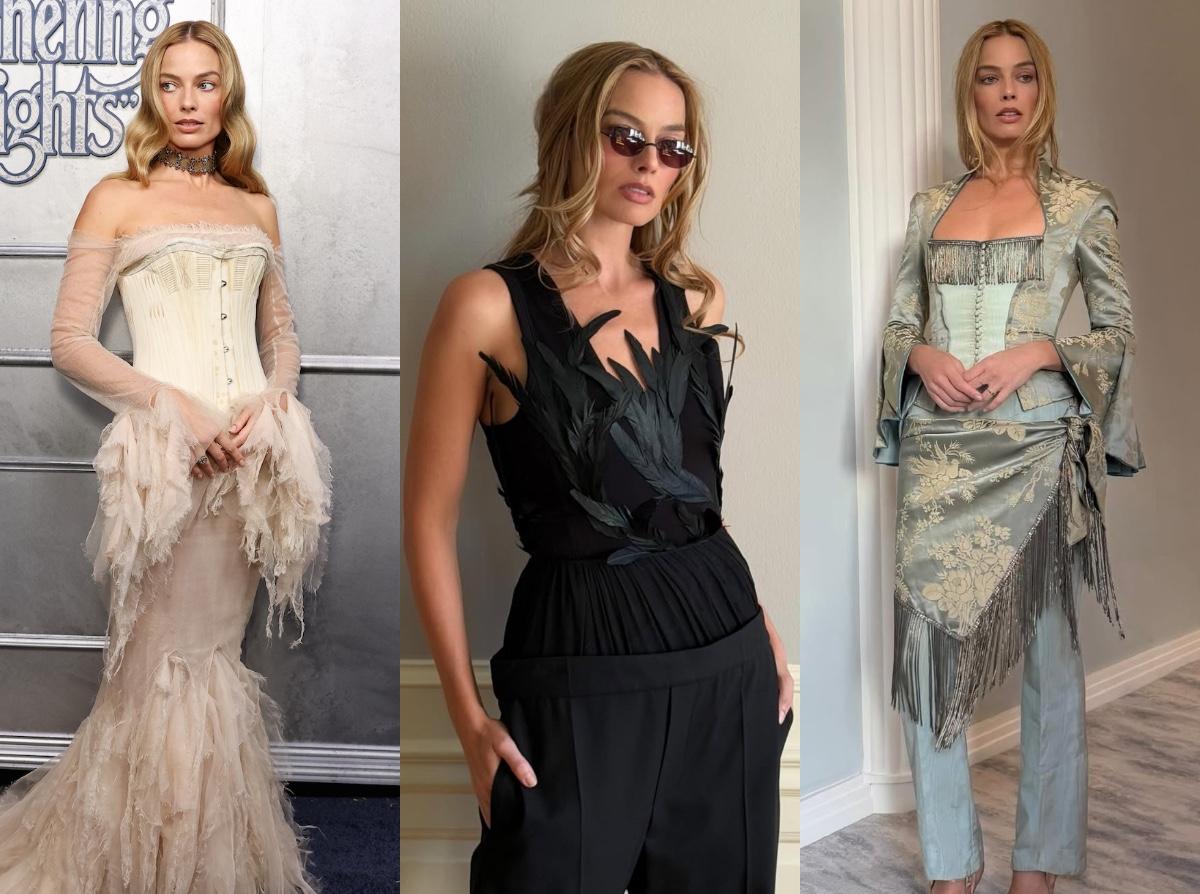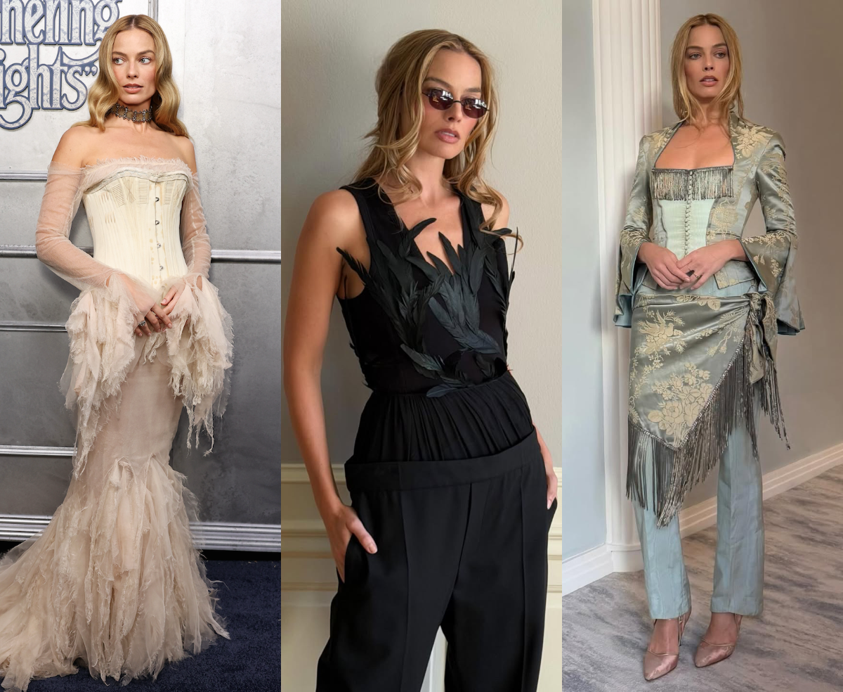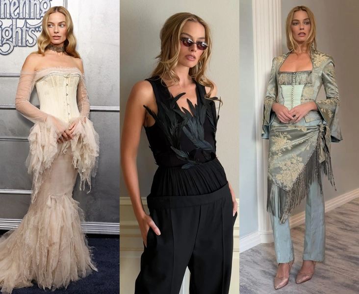 В последний месяц Марго Робби буквально не исчезает из нашей ленты — и дело не только в том, что она вместе с Джейкобом Элорди возит по миру свежую экранизацию «Грозового перевала». Гораздо интереснее то, что теперь внимание приковано не к самой Марго, а к тому, как она рассказывает историю фильма через одежду — и это уже следующий уровень модной игры после эпохи «Барби». Тогда ее method dressing рисковал превратиться в бесконечный аттракцион в розовых тонах, сейчас же, в промо «Грозового перевала», ее стиль, кажется, стал идеальным — многослойным, символичным и требующим внимательного прочтения.