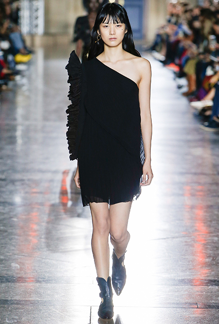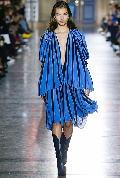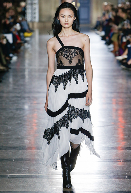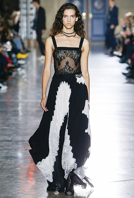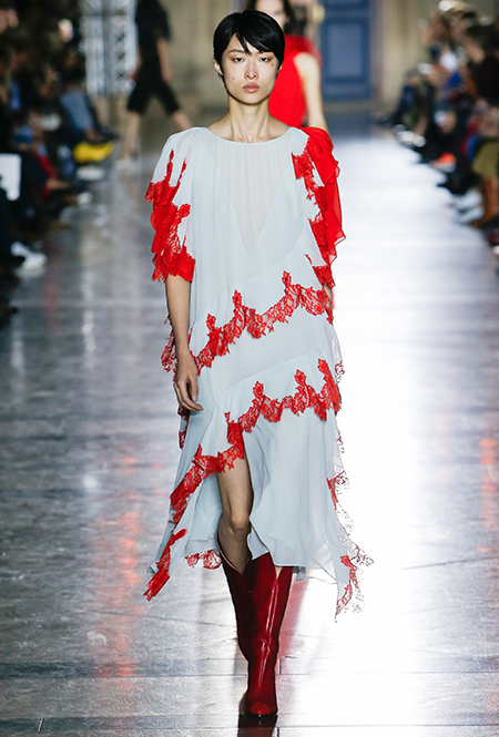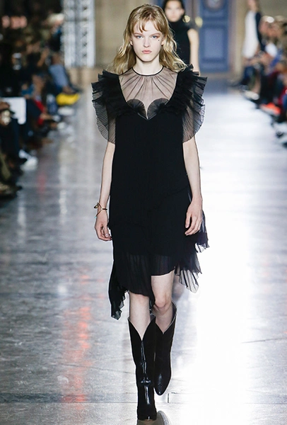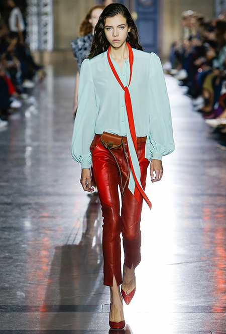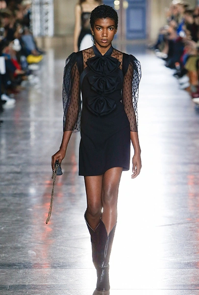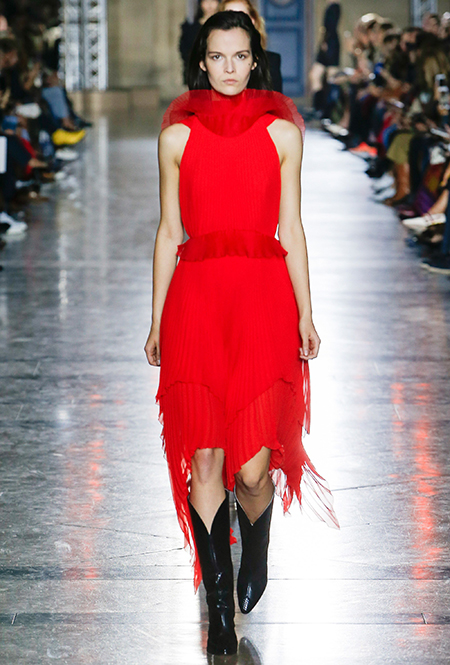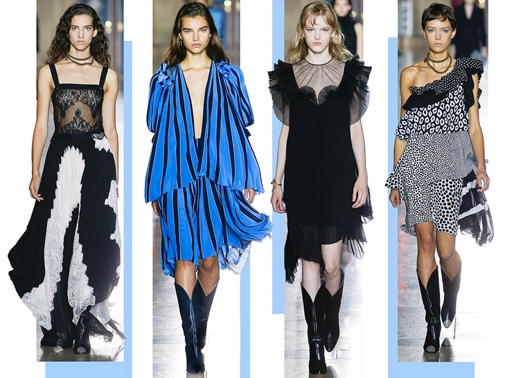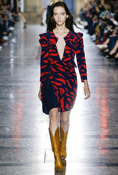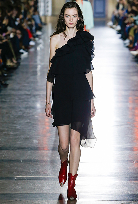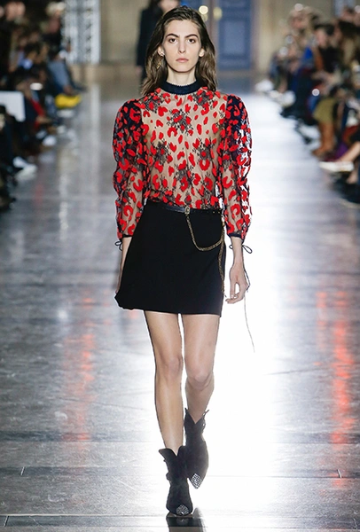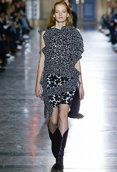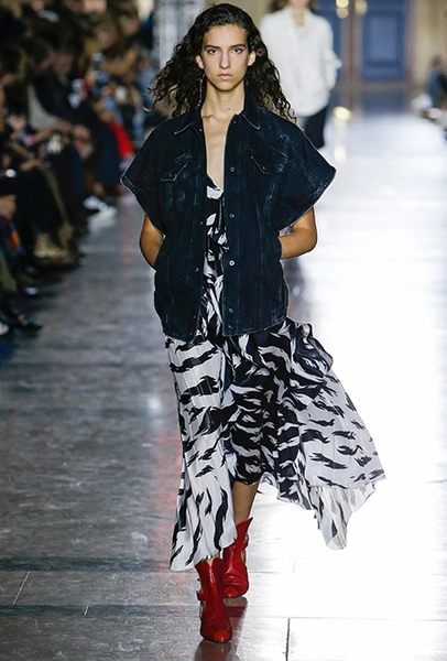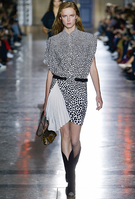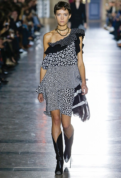 Правы оказались лишь те, кто утверждал первое. В коллекции SS18 действительно нашлось место оборкам и легким платьям с ассиметричными подолами. Но ассоциаций со стилем Chloe они практически не вызывают. Уэйт Келлер провела не один час архивах Givenchy (и даже встретилась лично с самим основателем модного дома) и выбрала драматичные цвета и принты, характерные для легендарного бренда. Это экспрессивный алый и черно-белый «леопард», крупный черный горошек родом из 80-х и рисунок в виде клевера, который был популярен в 60-е.
