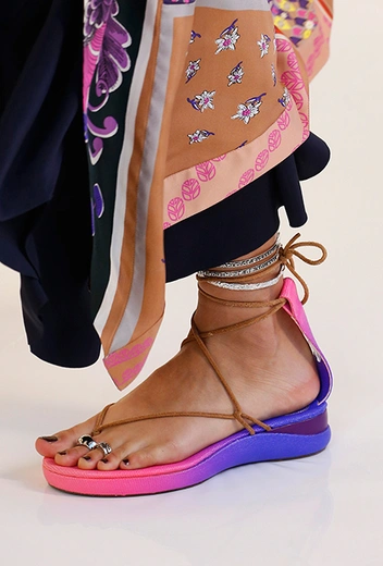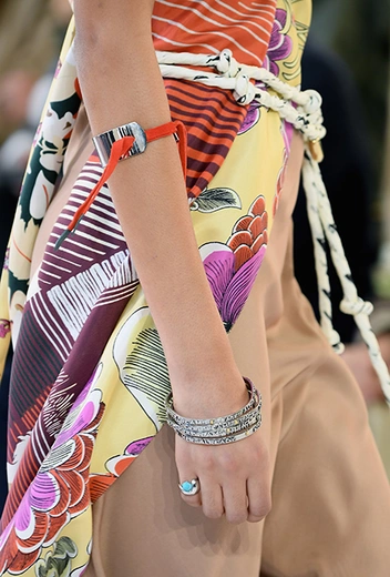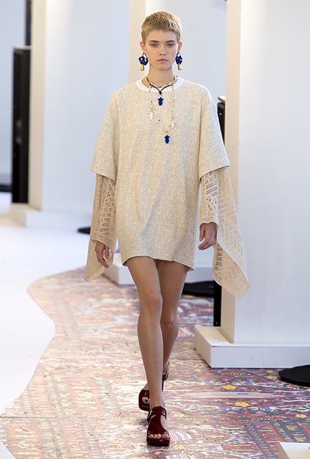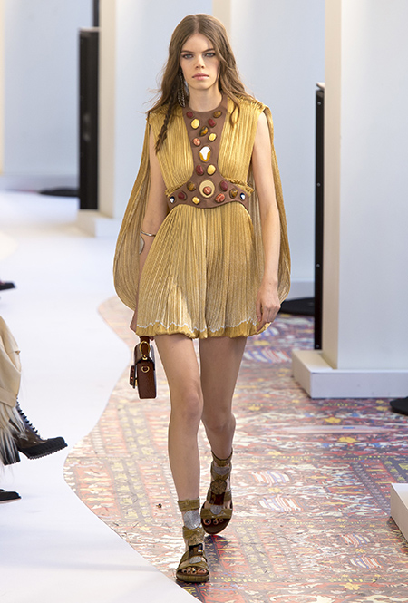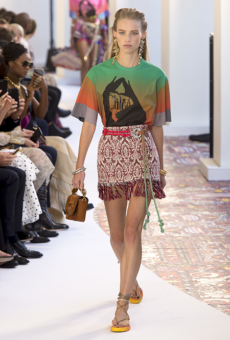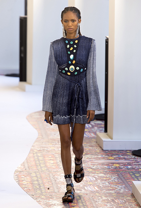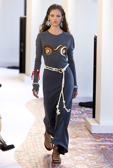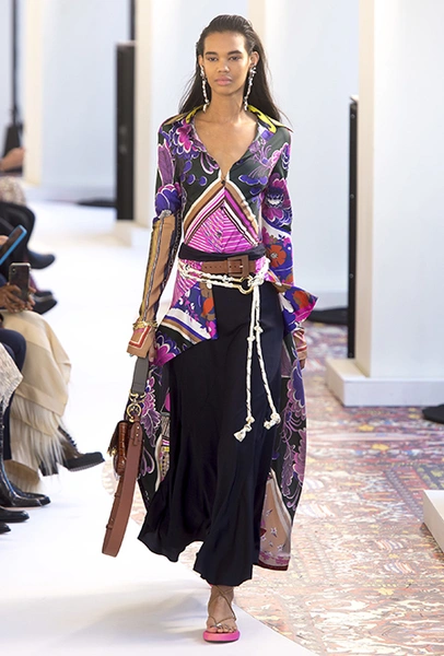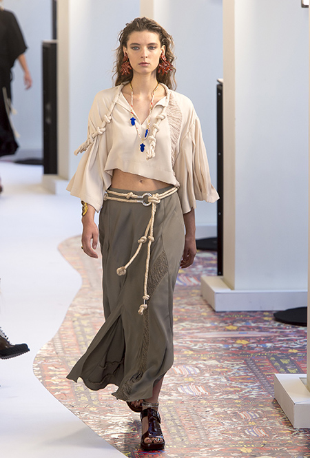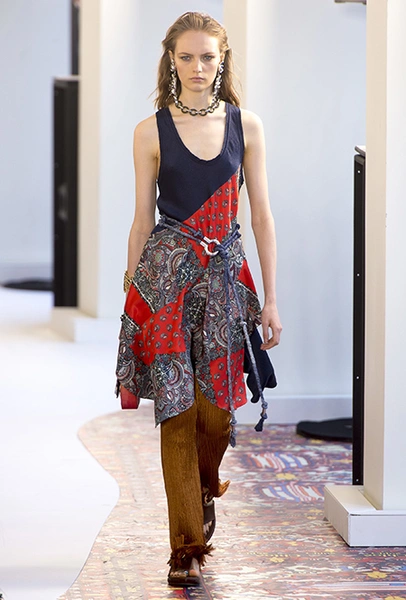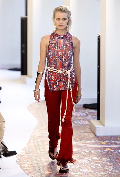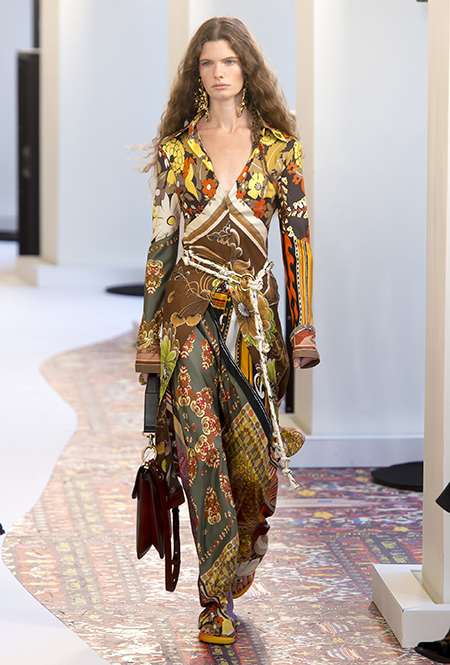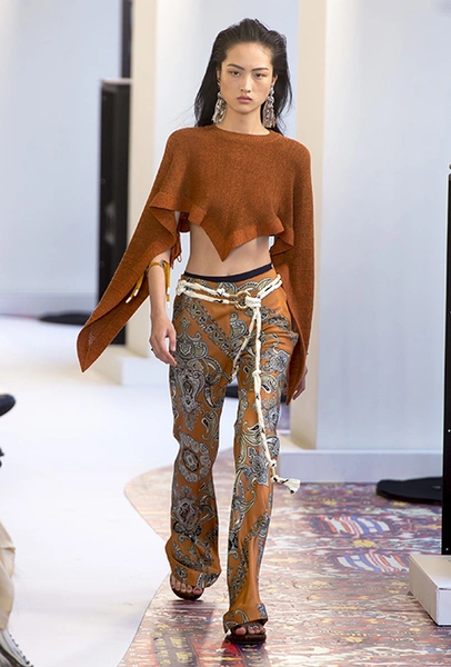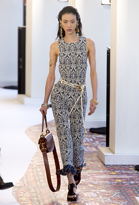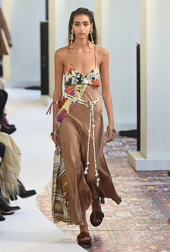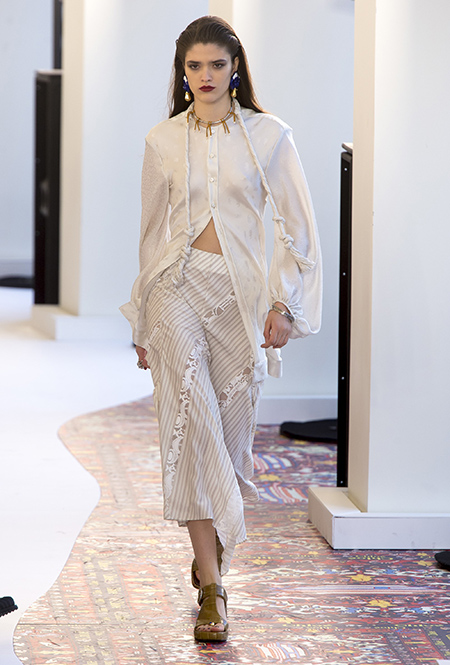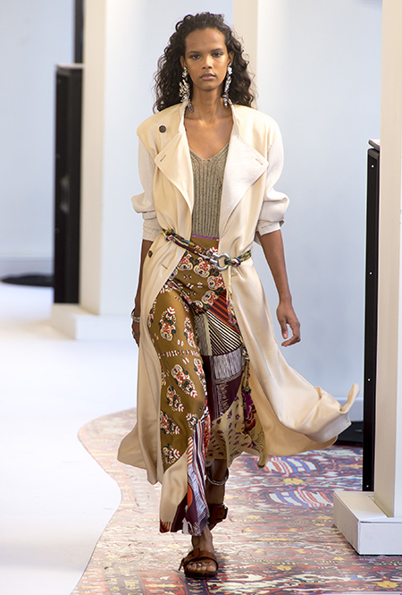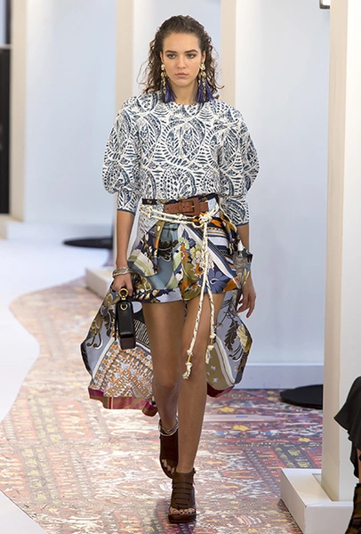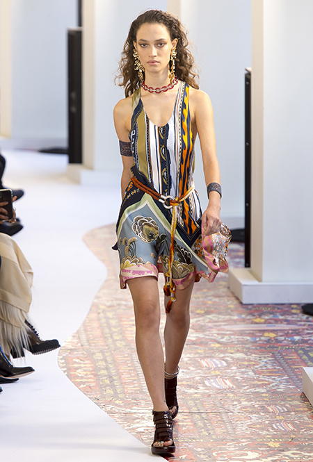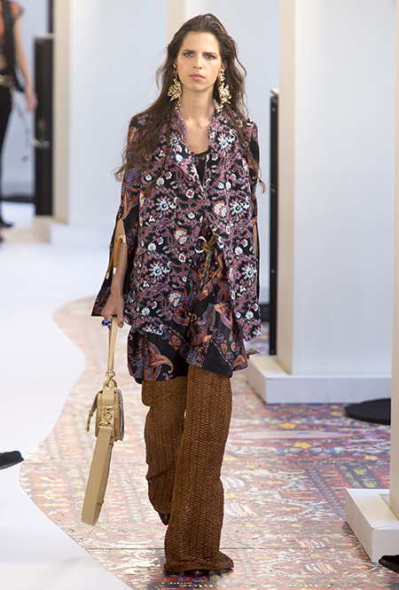 За основу для весенне-летнего сезона дизайнер взяла платки с затейливым рисунком пейсли во всем их многообразии: из принтованного шелка были выполнены топы и рубашки, свободные брюки-клеш, платья в пол, шорты и комбинезоны. Фоном для этого цветового многообразия послужили просторные силуэты в стиле бохо родом из 70-х, а струящиеся и легкие материалы уравновешивали крупные детали: пояса-веревки в сочетании с кожаными ремнями, декор в виде крупных камней, рассыпанных на лифе плиссированных платьях, массивные серьги и длинные подвески.