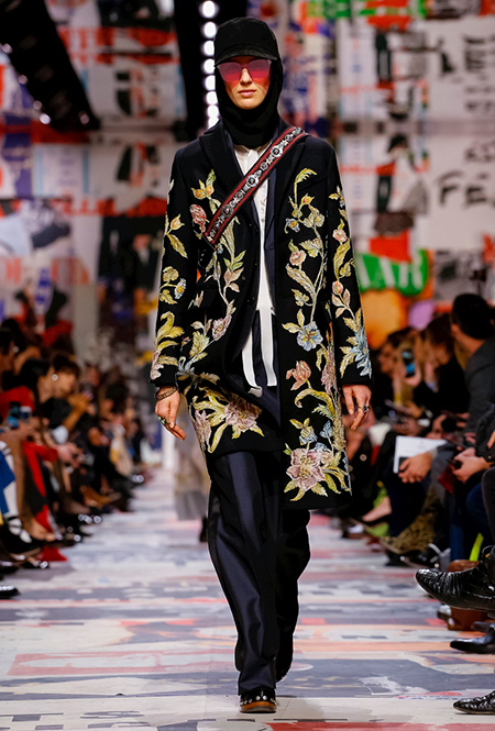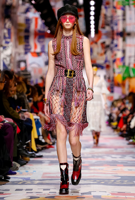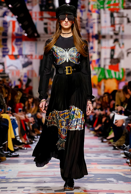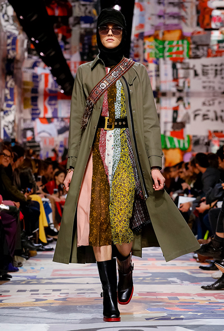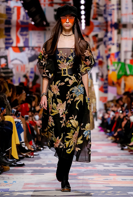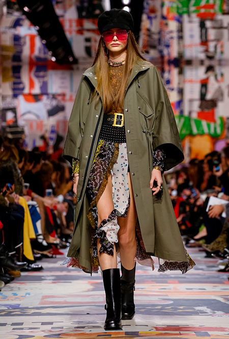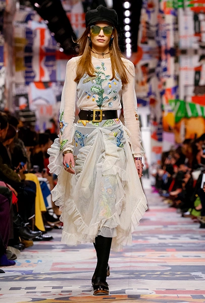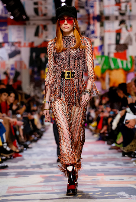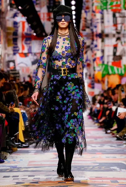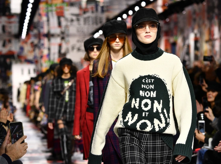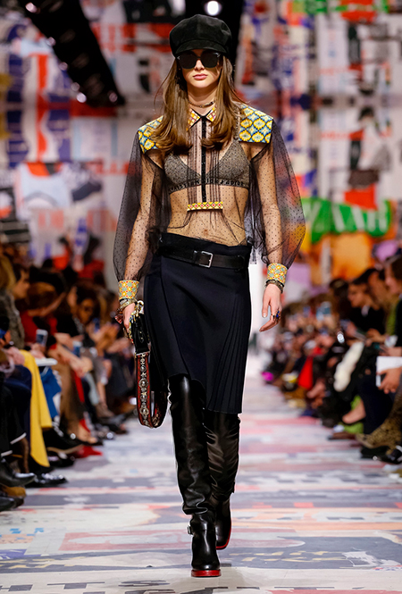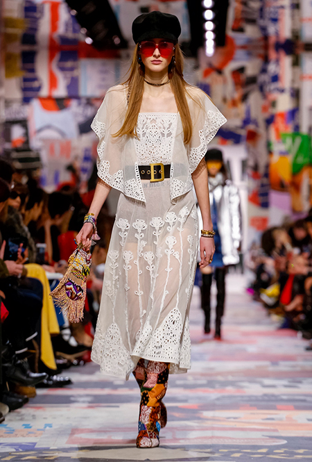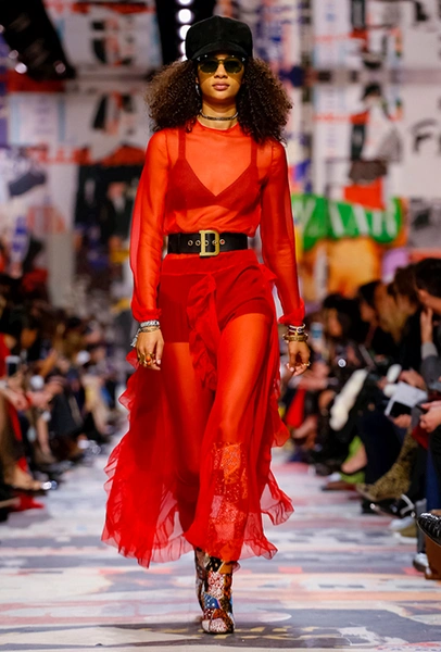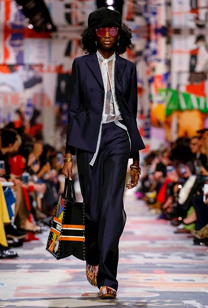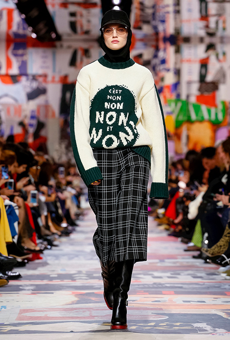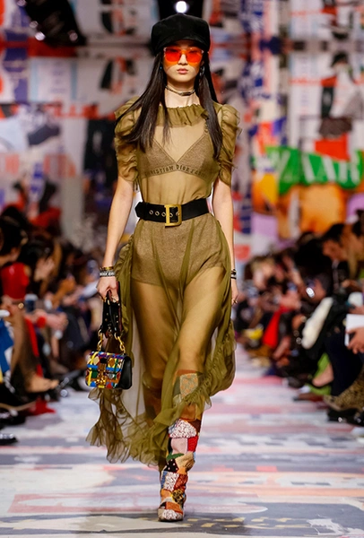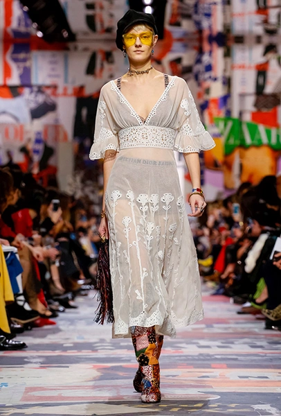 Cherchez la femme — «ищите женщину» — эта фраза применима к каждой коллекции Марии Грации для Dior с момента ее громкого «взошествия на престол» в июле 2016 года. Практически всегда она вдохновляется творчеством или образом той или иной знаменитой женщины. На этот раз музой стала Диана Вриланд, легендарный главный редактор Vogue, гранд-дама во многом определившая модные и культурные 60-е. Ее фраза «Шестидесятые были эпохой личностей…» стала эпиграфом к коллекции. А емкое, непереводимое на русский язык понятие youthquakers, которым Вриланд описала юных и дерзких звезд эпохи, вроде Твигги и Эди Сэджвик, вполне применимо к героине будущего сезона Dior – сексуальной, свободолюбивой бунтарке, что без стеснения носит прозрачные блузки и чей любимый слоган – C’est non, non, non et non! («Нет, нет, нет и нет!»). Свитер с такой надписью открыл показ, и многие сочли это ответом Кьюри на череду скандалов, связанных с харассментом в кино- и модной индустриях.