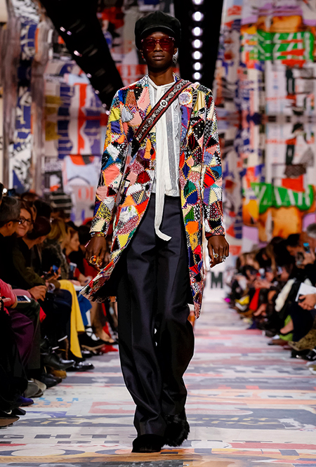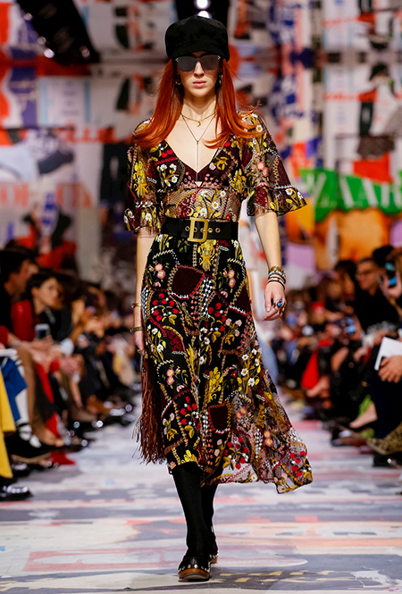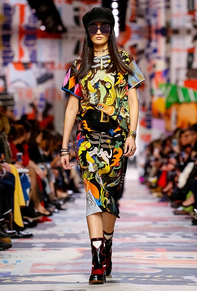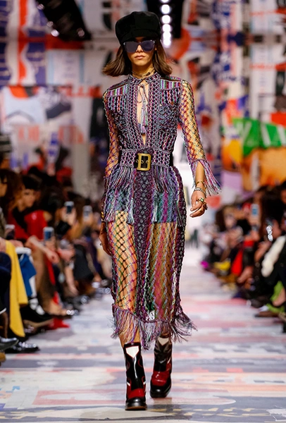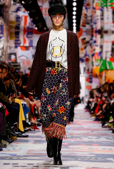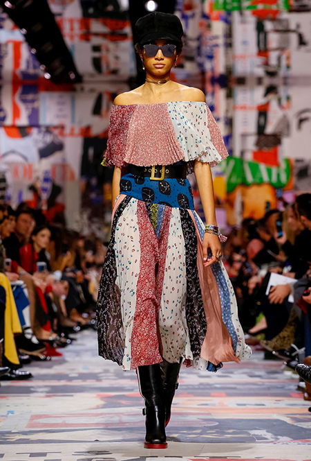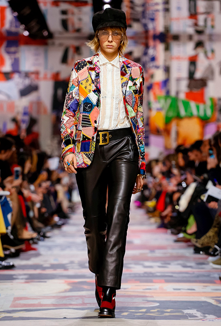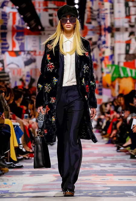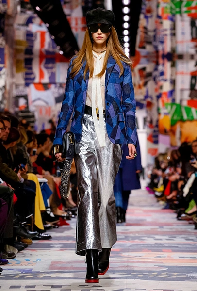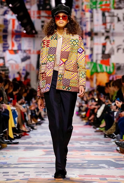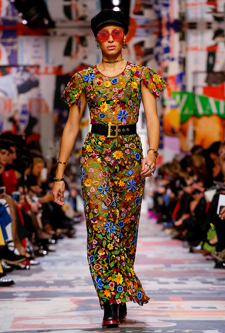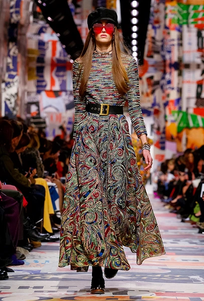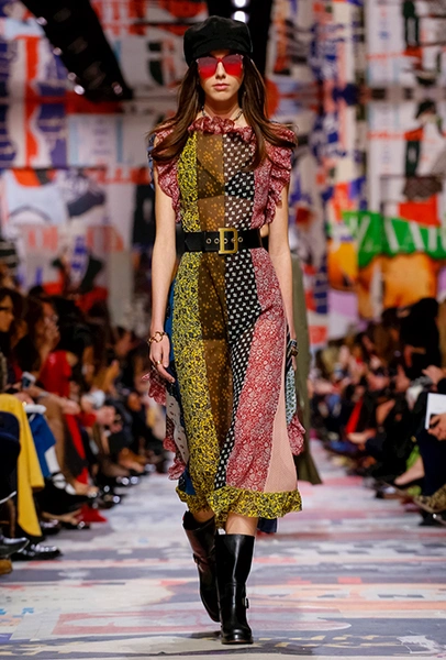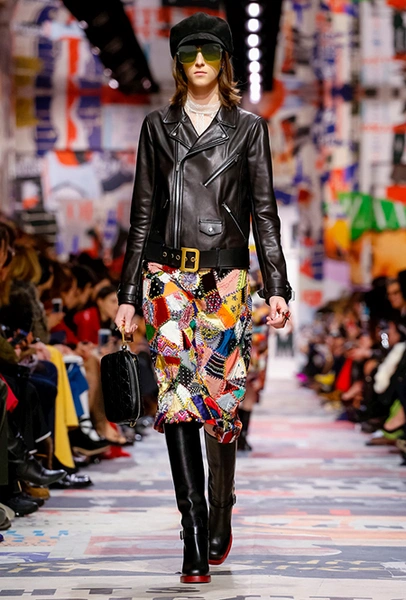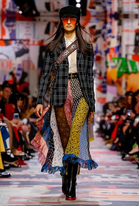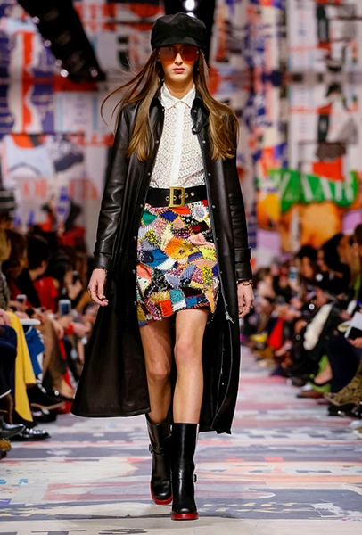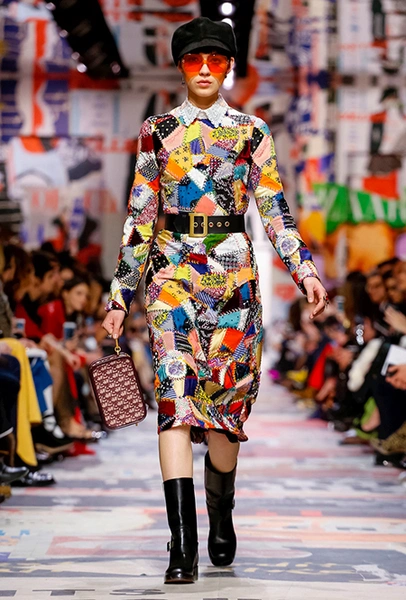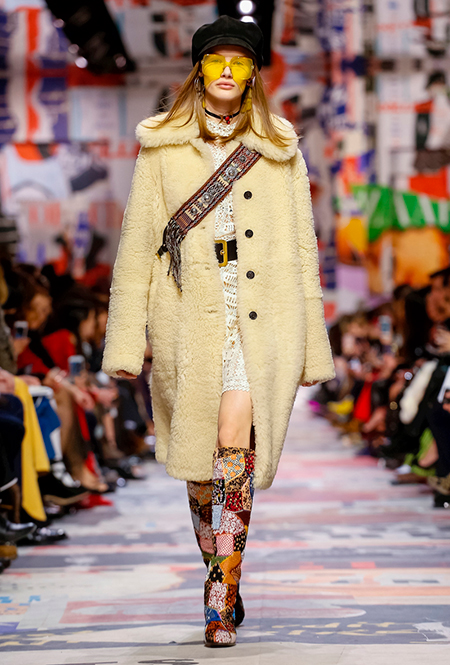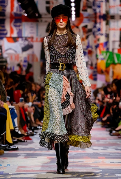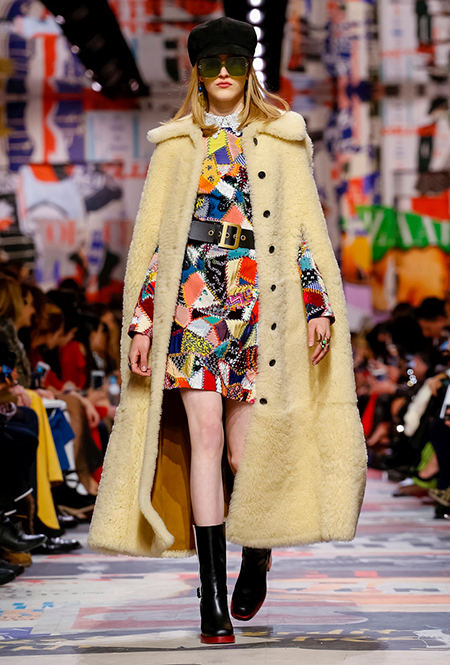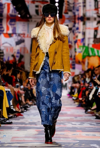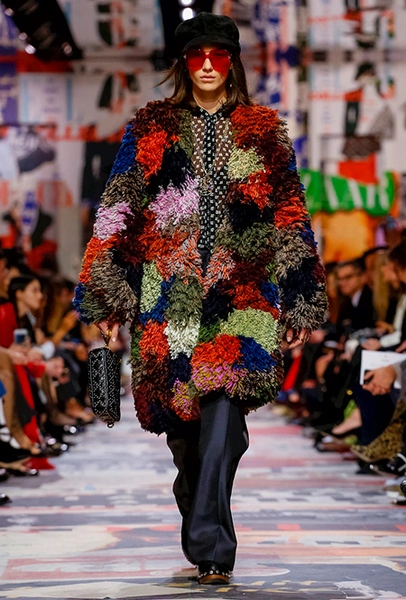 Еще один «привет» из эры «детей цветов». На этот раз у Dior есть огромное число вещей, сшитых будто из десятков разноцветных лоскутов. Это и лаконичного кроя жакеты и строгие облегающие платья и юбки из невесомой ткани. И даже одна объемная шуба — наверняка будущий хит.