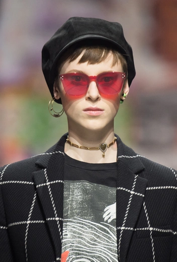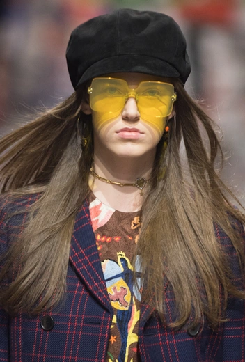 Очки с цветными стеклами носил Джон Леннон – икона 60-х и идол как бунтарей, так и хиппи. Его очки были оранжевые и в круглой оправе, Мария Грация пошла чуть дальше – выпустила сразу несколько моделей. Цвета – от оранжевого до розового. Сами очки крупные, наполовину скрывающие лицо. Несмотря на неполное сходство с первоисточником, ассоциация считывается мгновенно.
