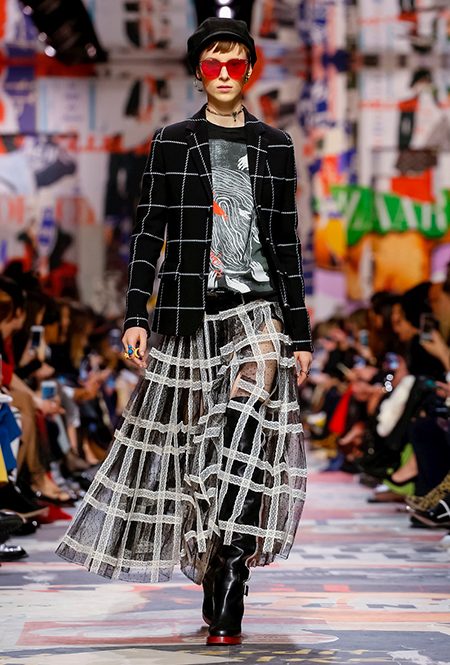 Объемные клетчатые жакеты, брючные костюмы и плиссированные юбки А-силуэта – все это легко представить на тех самых студентках из мая 1968 г. Клетка в коллекции есть как черно-белая, так и цветная. А жакеты Кьюри смело миксует с полупрозрачными многоярусными юбками – прозрачные ткани уже стали одной из примет стиля Dior периода Кьюри.
