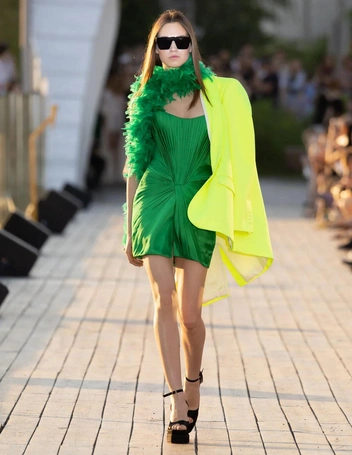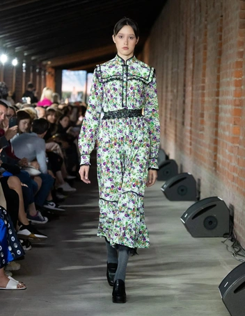 На подиуме романтичные и женственные образы были замиксованы с грубой обувь и очками в футуристичном стиле. Вещи из новой коллекции марки будут уместно смотреться с тренчами, пальто и кожаными куртками осенью, а также с грубой обувью — ботинками и челси.