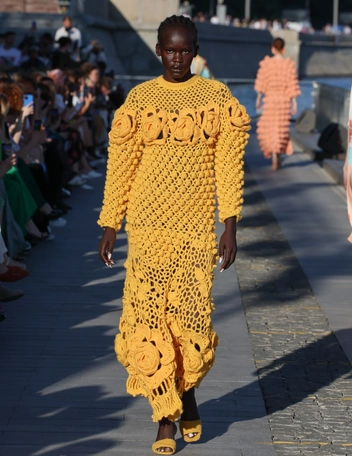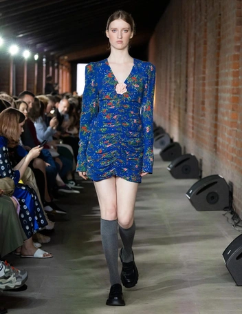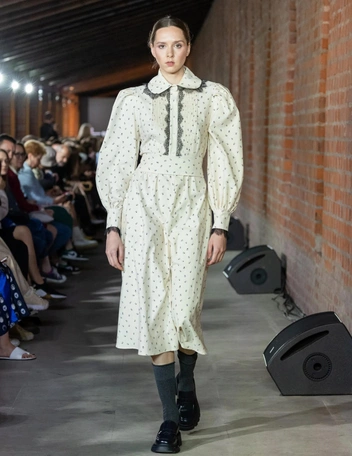 Важной частью новой линейки стали платья. В коллекции Loom by Rodina есть летящие модели с наивным принтом, всегда актуальные платья с цветочным рисунком, украшенные контрастными кружевными вставками и дополненные ажурным воротником, а также модные модели длины мини с вырезом в зоне декольте. По примеру стилистов на показе сочетаем легкие платья с сапогами на каблуке, плотными гольфами и носками, а также с лоферами на каблуке и полуботинками на грубой подошве.