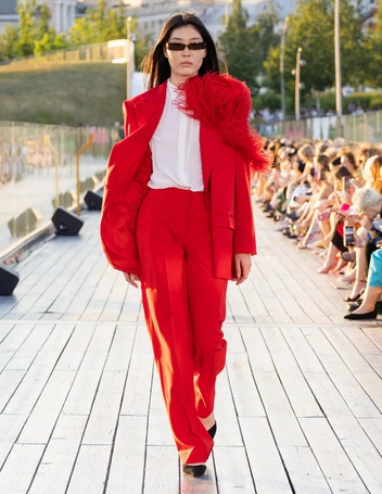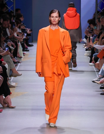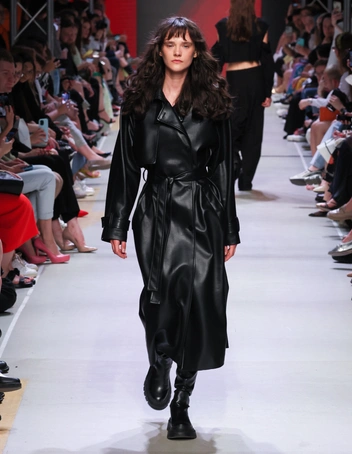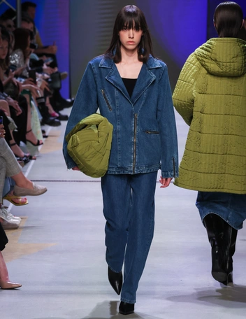Дизайнер выполнила их в насыщенной цветовой палитре, ярком оранжевом и красном, а также показала вариации из альтернативных материалов — экокожи и денима. В комплекте с эффектными костюмами Фомичева предлагает носить кожаные тренчи, объемные клетчатые пальто, дополняя образы грубыми ботинками, балаклавами и вместительными сумками (читайте также: Как подобрать брючный костюм, который вас не разочарует).