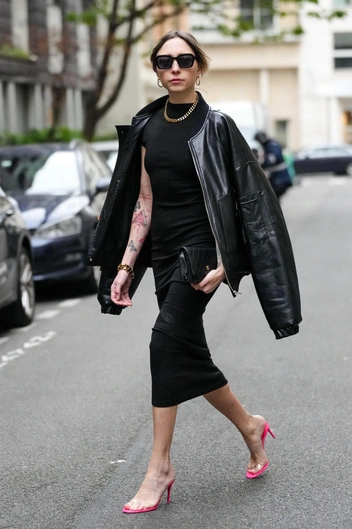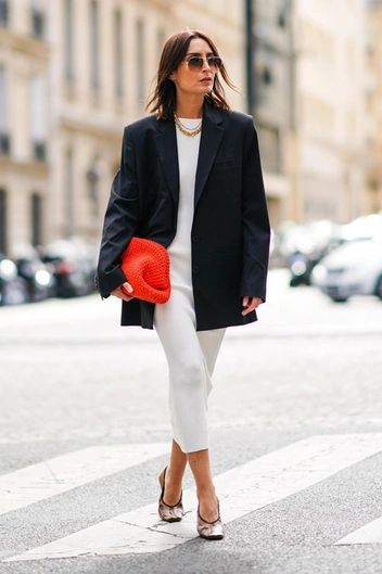 Этот образ — настоящий ультрамодный офискор, который в 2024 году покорил сердца женщин всех возрастов: от Дженнифер Лопес до Хейли Бибер. Не подумайте, что это слишком строгий и взрослый лук — напротив, он выделит вас среди других мам и придаст вам статус и уверенность в себе. А чтобы снизить градус серьезности, выберите юбку с разрезом или же акцентные туфли со змеиный принтом.