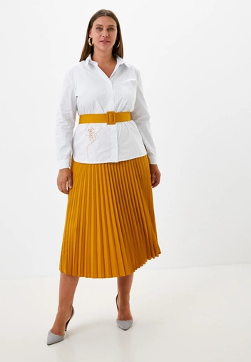 Какую модель выбрать? Вы можете надеть костюм из жакета и юбки или же выбрать яркую юбку и дополнить ее классической рубашкой. Праздничность образу можно добавить за счет обуви и аксессуаров: например, завершите лук туфлями, украшенными камнями, подберите изящный клатч и повяжите на шею шелковый платок.