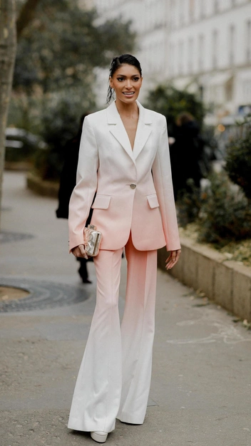 Придерживайтесь в аутфите минимализма и простоты, только тогда костюм будет выглядеть модно и притягательно (читайте также: Как выбрать правильный брючный костюм по типу фигуры). Отдайте предпочтение объемному жакету прямого кроя и широким брюкам, подберите к ним закрытые туфли или босоножки, небольшую сумку и массивные украшения.