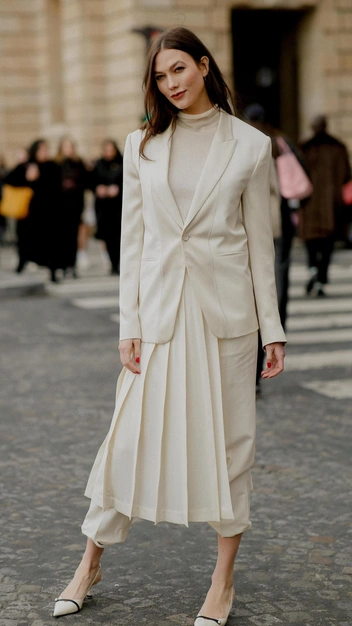 Если же брючный костюм кажется вам слишком смелой идеей, тогда примерьте комплект юбки и пиджака — это беспроигрышный вариант, который всегда будет смотреться эффектно. К тому же в таком образе вам будет удобно, так как в любой момент можно снять жакет и остаться только в блузе.