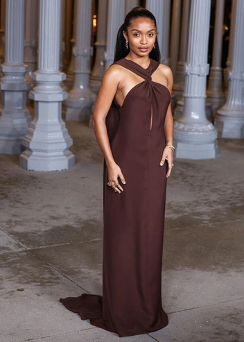 Речь об осенней свадьбе, поэтому не нужно делать ставку на «летние» варианты по типу шифона или атласа. Они смотрятся слишком невесомо для погоды, которая обычно присуща месяцам с сентября по ноябрь. Зато отлично подойдет бархат — эта ткань традиционно считается «осенней» и не просвечивает. К тому же, бархатный брючный костюм или платье — это хороший способ создать интересный акцент на образе, не перетягивая все внимание на себя.