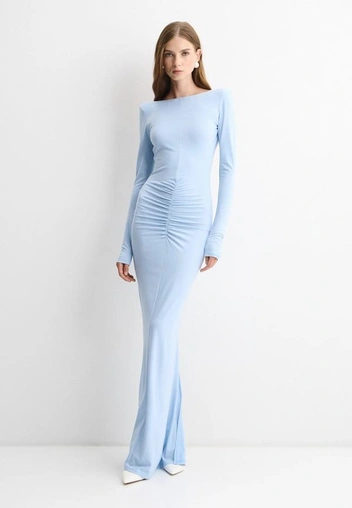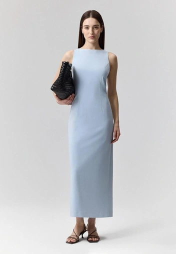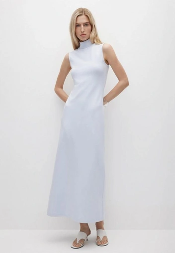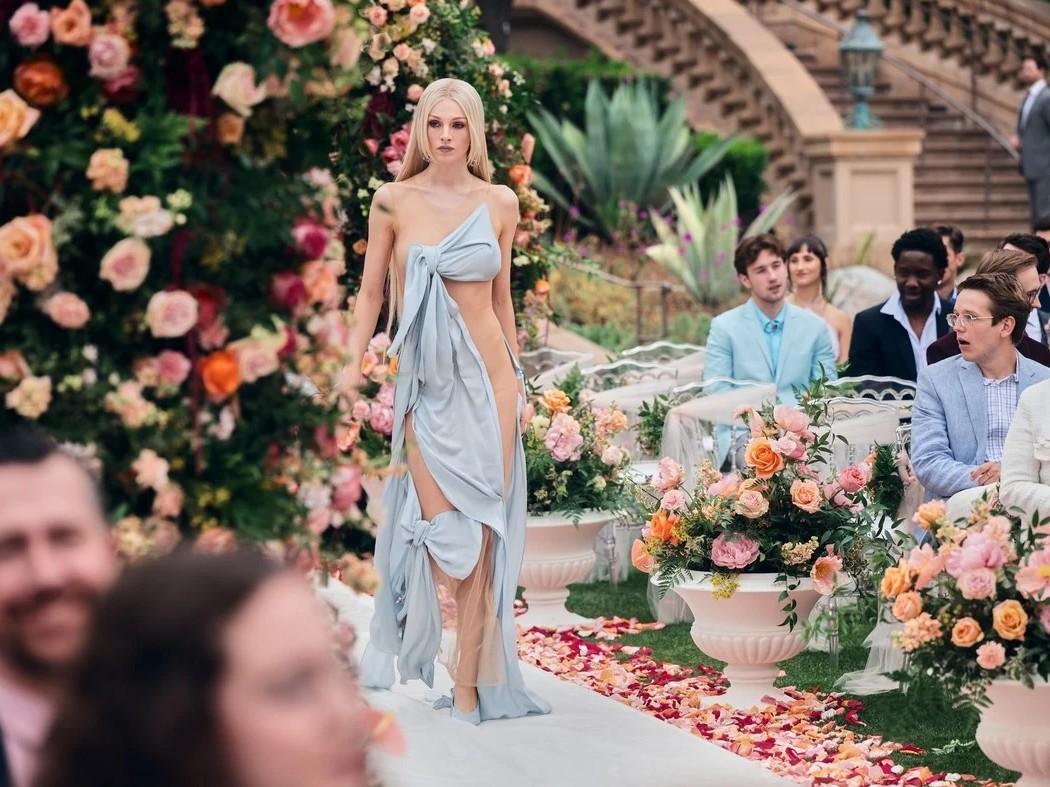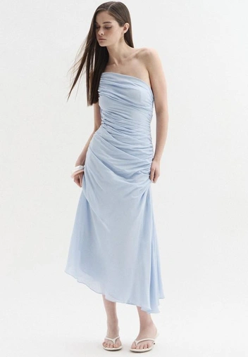 На героине мы видим подиумное платье Acne Studios из коллекции весна-лето 2023. Пожалуй, главное, что можно из него почерпнуть, — идеальный голубой цвет. Нежный и приглушенный оттенок окажется безупречным выбором для романтичного мероприятия, особенно, если торжество проходит летом. Дополнить его советуем лодочками в тон, как это сделала Джулс.