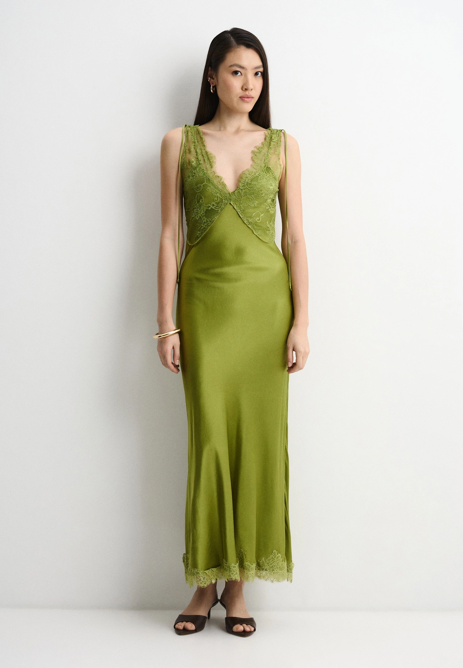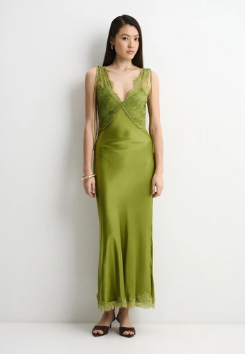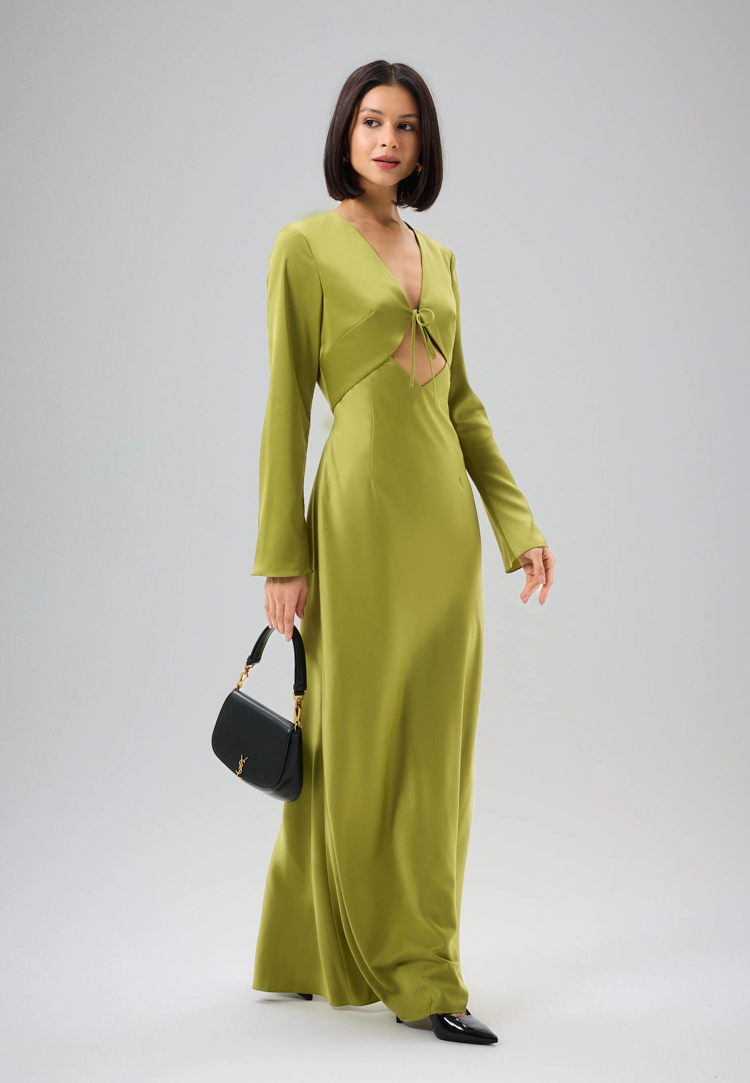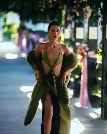 Например, выход Мэдди на свадьбе Кэсси. Героиня мстит экс-подружке, которая увела ее бойфренда, поэтому на праздник приходит во всеоружии. Для персонажа Алексы Деми Наташа разработала авторский наряд — дерзкое платье, которое оставляет мало пространства для фантазии, ведь в нем сочетаются и открытая спина, и глубокое декольте, и высокий разрез на юбке. Чтобы подчеркнуть роскошный вид Мэдди, дизайнер дополнила образ цепочками-перемычками, украшенными кристаллами, меховой накидкой и эффектными туфлями Saint Laurent Babylone. К слову, зеленый цвет тоже выбран неслучайно. В финальном эпизоде второго сезона героиня уже носила похожий оттенок, когда мстила Кэсси. Поэтому наряд вдвойне подчеркивает настроение персонажа.
