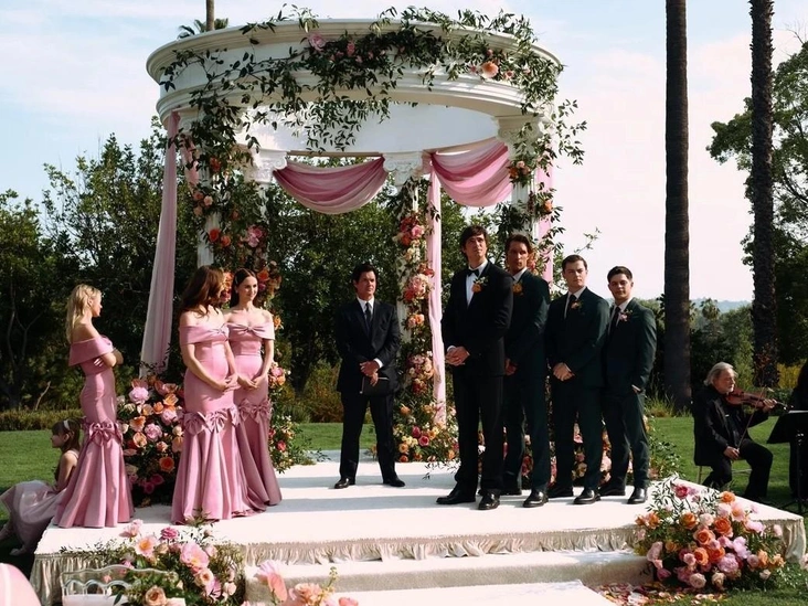 Одной из трех главных подружек невесты стала Лекси. Она, как и другие героини, была в розовом платье Nana Jacqueline со спущенными плечами, плотным корсетом, целым рядом бантов и юбкой в складку, за что Complex прозвал их «финальными боссами кокеткора» (читайте также: Почему с возрастом нам начинает нравиться розовый цвет — и это хорошо).