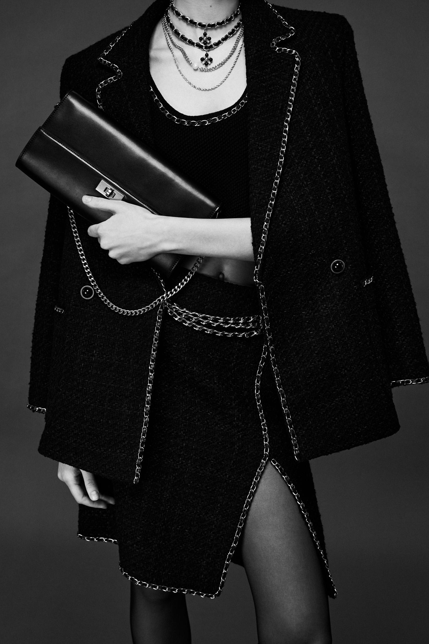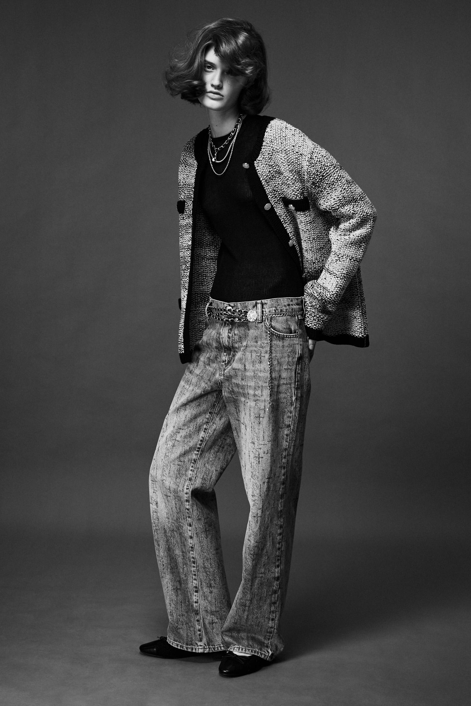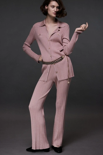 Цвета дропа: черный, белый и актуальный сегодня нежно-розовый. В этом оттенке представлены облегающие брюки, кардиган из тонкого трикотажа с люрексом и полупрозрачная блуза с оборками. Носить ее можно на контрасте с расклешенной джинсовой макси-юбкой. К наряду можно добавить многослойные ожерелья из искусственного жемчуга и пояса из крупных цепей. Завершат образ кожаные туфли на маленьком каблуке с открытым мысом, текстильные балетки и прямоугольная сумка.