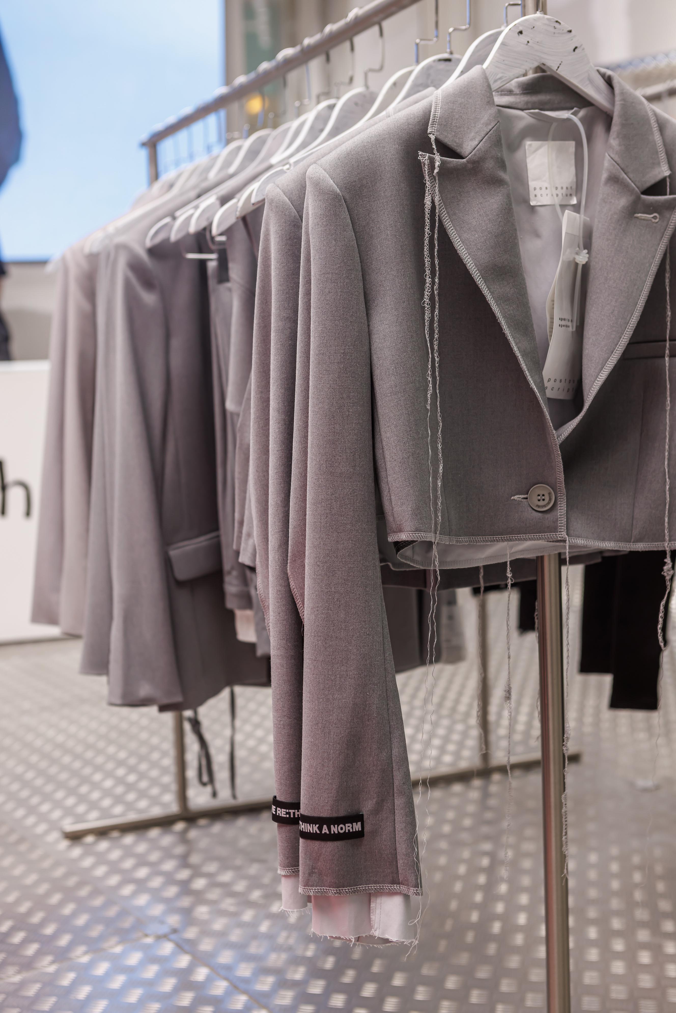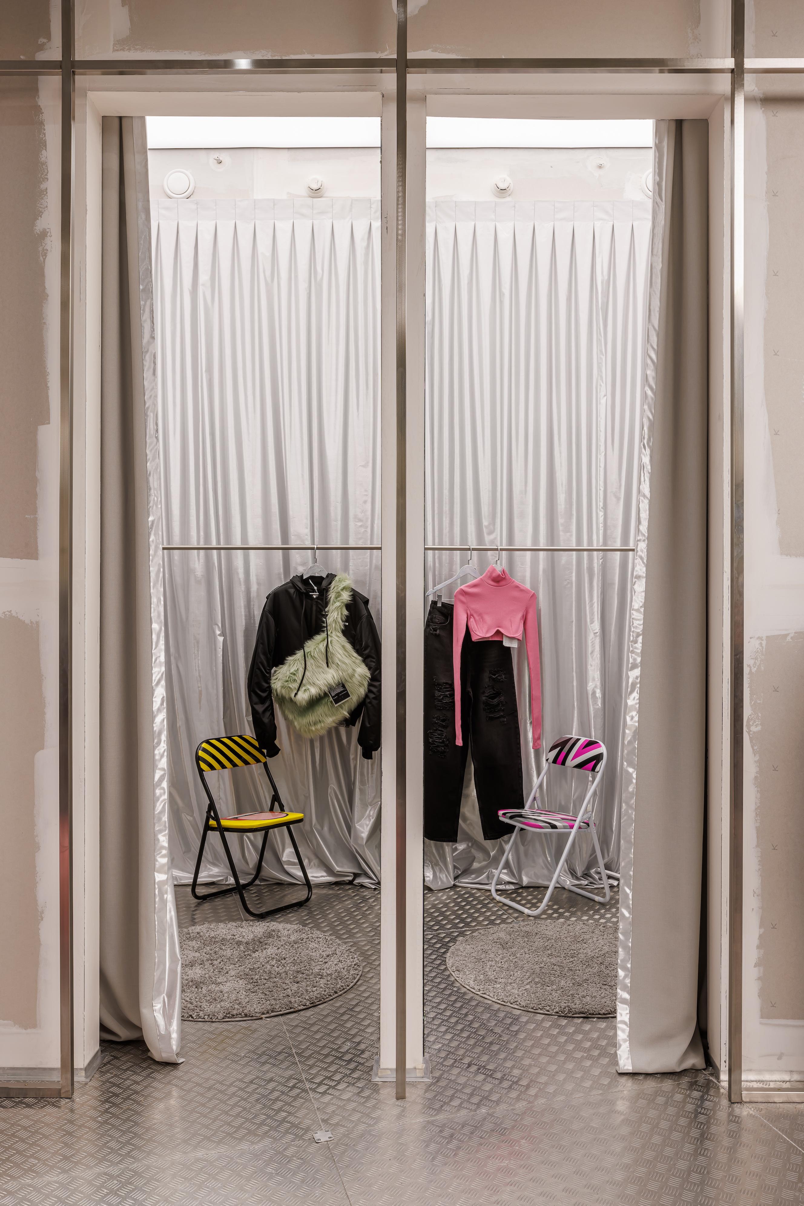 Акцентные пуфы, меняющие свой внешний вид, наполнение и обивку, окрашены вручную. С вшитыми в чехлы переработанными вещами они интегрировались в интерьеры в поддержку upcycle-коллекции. Манекены — результат со-творчества с художником по волосам, придумавшим для p.p.s. законченные стили и наделив их самобытным характером.
