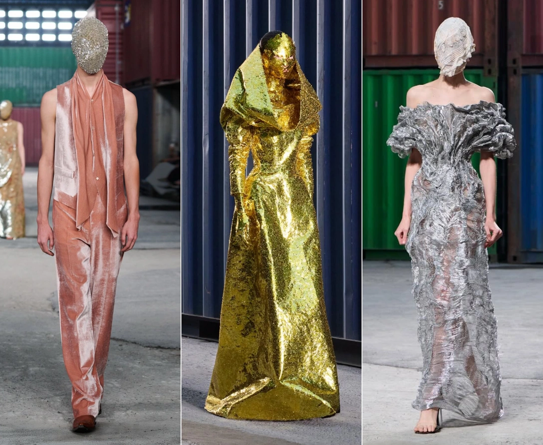 Воск и застывший металл — платья и корсеты будто вылиты из золота и жатого металла, а подолы залиты воском, застывшим в движении, — как свеча, которую погасили в самый драматичный момент.