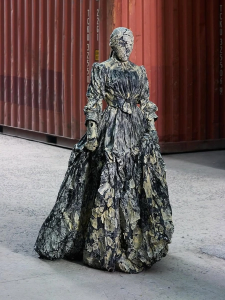 В этом контексте логично смотрятся и фарфоровые куклы начала 20 века, которыми вдохновлялся Мартенс: модели в масках и жестких, скульптурных силуэтах напоминают экспонаты, которым позволили на пару минут сойти с постамента (читайте также: Десять главных трендов Парижской недели моды 2026).