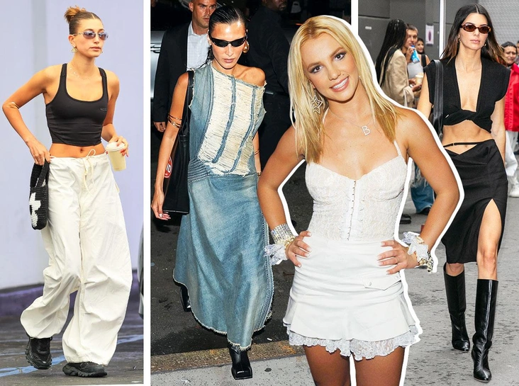 Что касается джинсов с заниженной талией — вопрос на миллион долларов. Многие дизайнеры начали отшивать модели а-ля юная Бритни, но не каждая решится снова надеть такую вещь. Можно оставить любимые брюки-карго или широкие джинсы с высокой талией, дополнив их кроп-топом в стиле Y2K с ярким принтом, с Барби или Диснеевской принцессой — будет смотреться свежо и одновременно с отсылкой к нулевым, особенно в тандеме с сумкой-багетом или пластиковыми сережками.