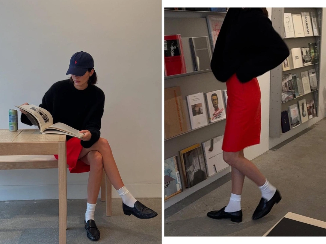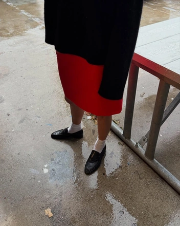 Сочетание лоферов с носками выглядит олдскульно, а потому хорошо сочетается с лаконичными строгими образами: например, костюмами с шортами брогами. Но можно также добавить пару трендов: к примеру, Кендалл надела лоферы с юбкой низкой посадки красного цвета (одного из главных в этом году), и темно-синим джемпером из кашемира. Еще один вариант — что-то среднее между строгостью и расслабленностью — платье-рубашка. Оно не будет резать линию ног и актуально вне зависимости от Недель моды.