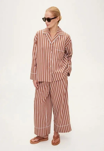 Пижамный комплект хорош с обувью, не перегружающей образ. Например, биркенштоками на пробковой подошве или модными желейными сандалиями. А для более прохладной погоды хороша стрилизация в стиле mix&match, когда мы сочетаем пижамный комплект с чем-то сильно контрастным. Например, пальто прямого силуэта, или вовсе шубой.