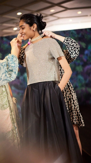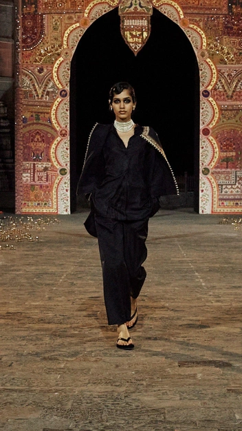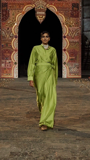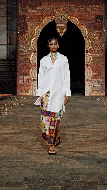 Мария Грация Кьюри показала коллекцию под самой туристической аркой в Мумбаи, которая была украшена лоскутами ткани, а обжигающий асфальт был устелен разноцветными коврами. Она посвятила работу сотрудничеству великого бренда со Школой рукоделия Чанакья, где сотни девушек проходят уроки по шитью, изучая самые сложные и изящные виды вышивки.