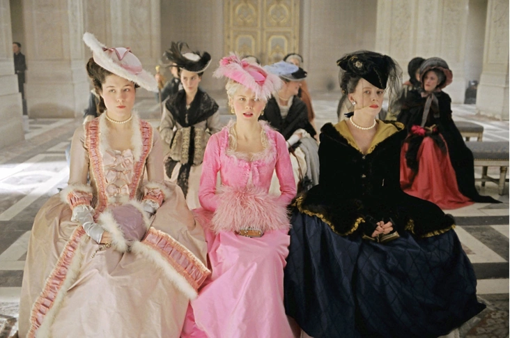 Один из самых знаковых образов этого красочного фильма Софии Копполы — эффектный ансамбль ярко-розового цвета с отделкой из белых перьев. Из-за множества перьев наряд выглядит размытым, особенно в сочетании с подходящей шляпой и муфтой.